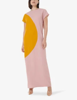 - Slim fit, scoop neckline, sleeveless, structured waistband, abstract pattern, flared hem
