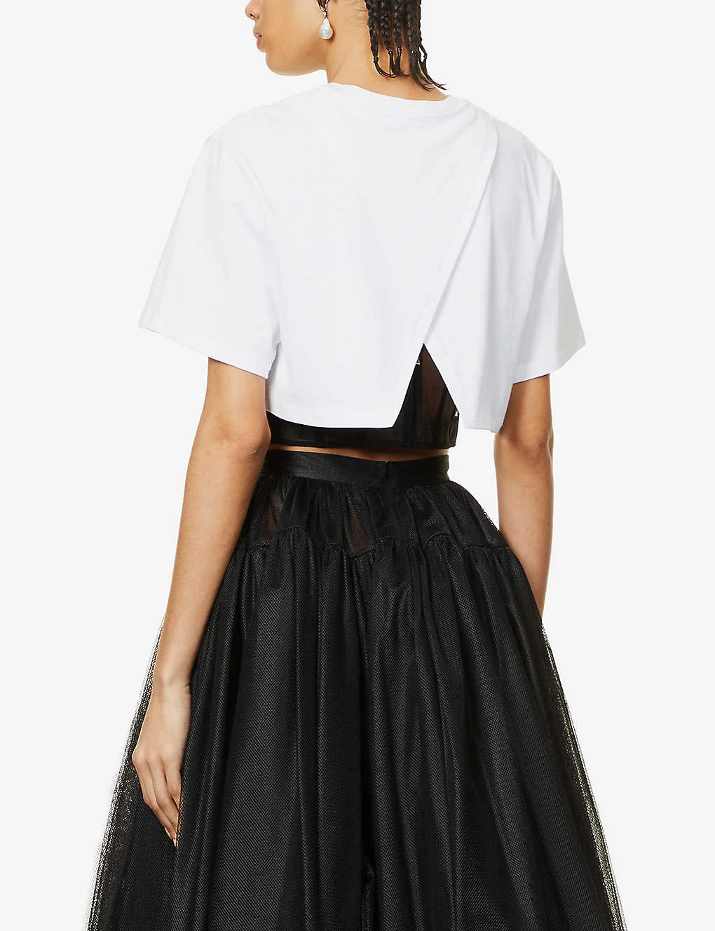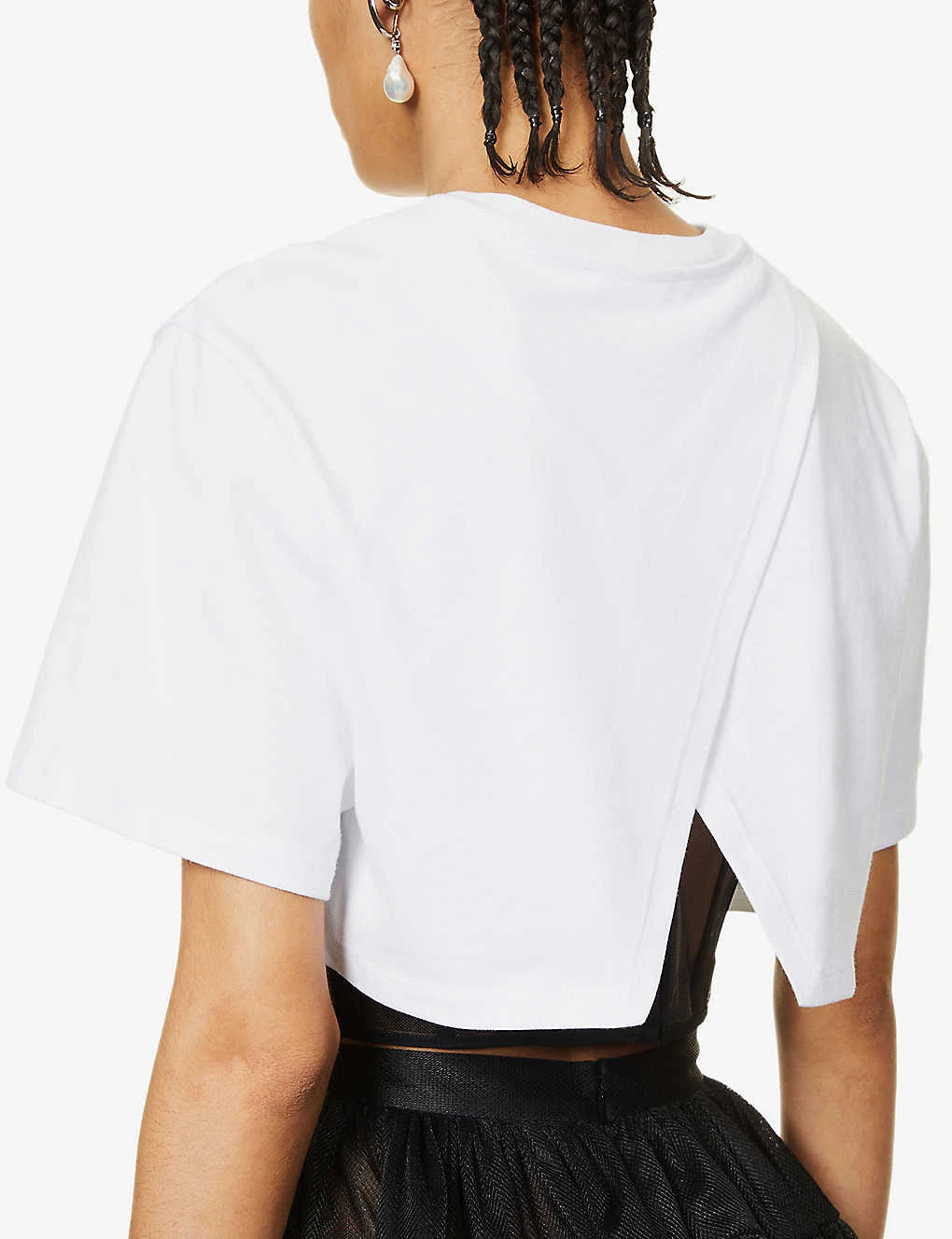 - Regular fit, cropped, round neck, ribbed trim at neck, short sleeves, crossover overlay at back, notched hem, mesh bodice underlay