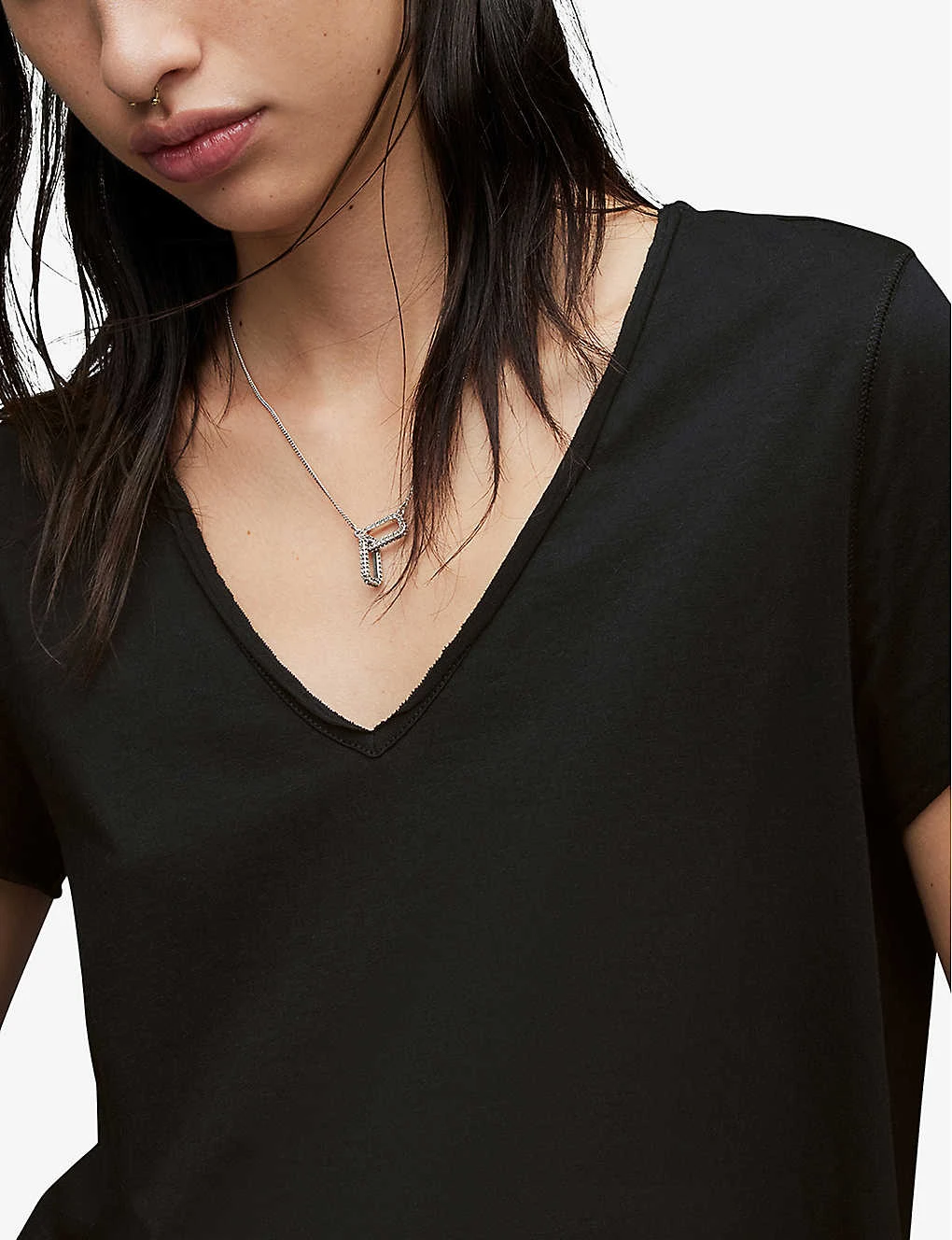 AllSaints cotton-jersey T-shirt Slips on V-neck, short sleeves, regular-fit, raw trims 100% cotton Machine wash inside out True to size Size 8: Length 28″” Model is 5ft 8″” and wears a size medium