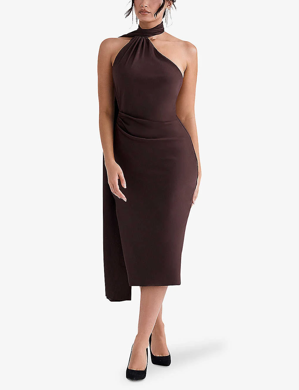 - Wrap neck, sleeveless, asymmetric bodice, midi skirt, open back, adjustable straps at back, cowl back