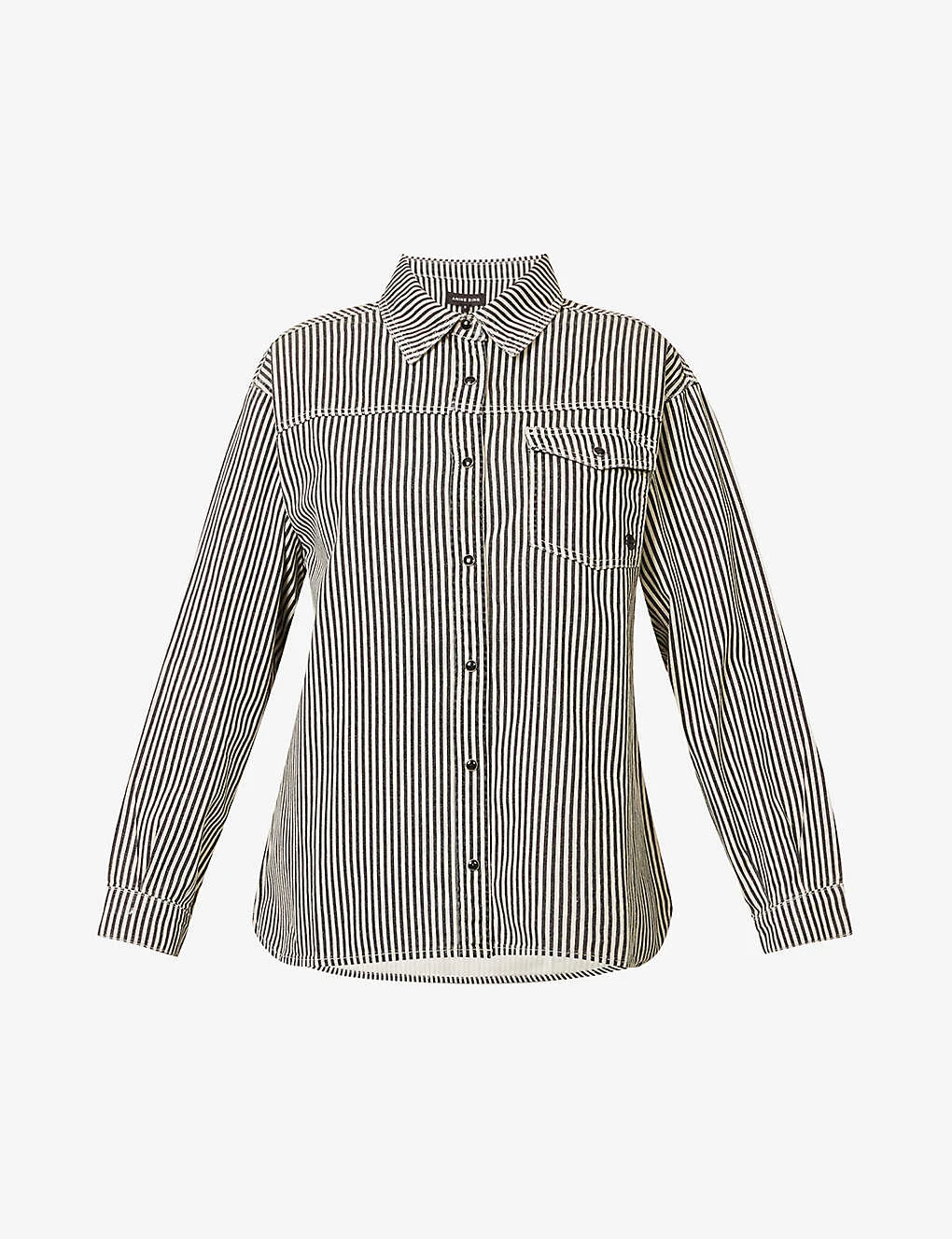 - Relaxed fit, collar, long sleeves, buttoned sleeve hems, flap pocket at chest, brand embroidery at chest, straight yoke with pleat at back, all-over stripe pattern, curved dipped hem