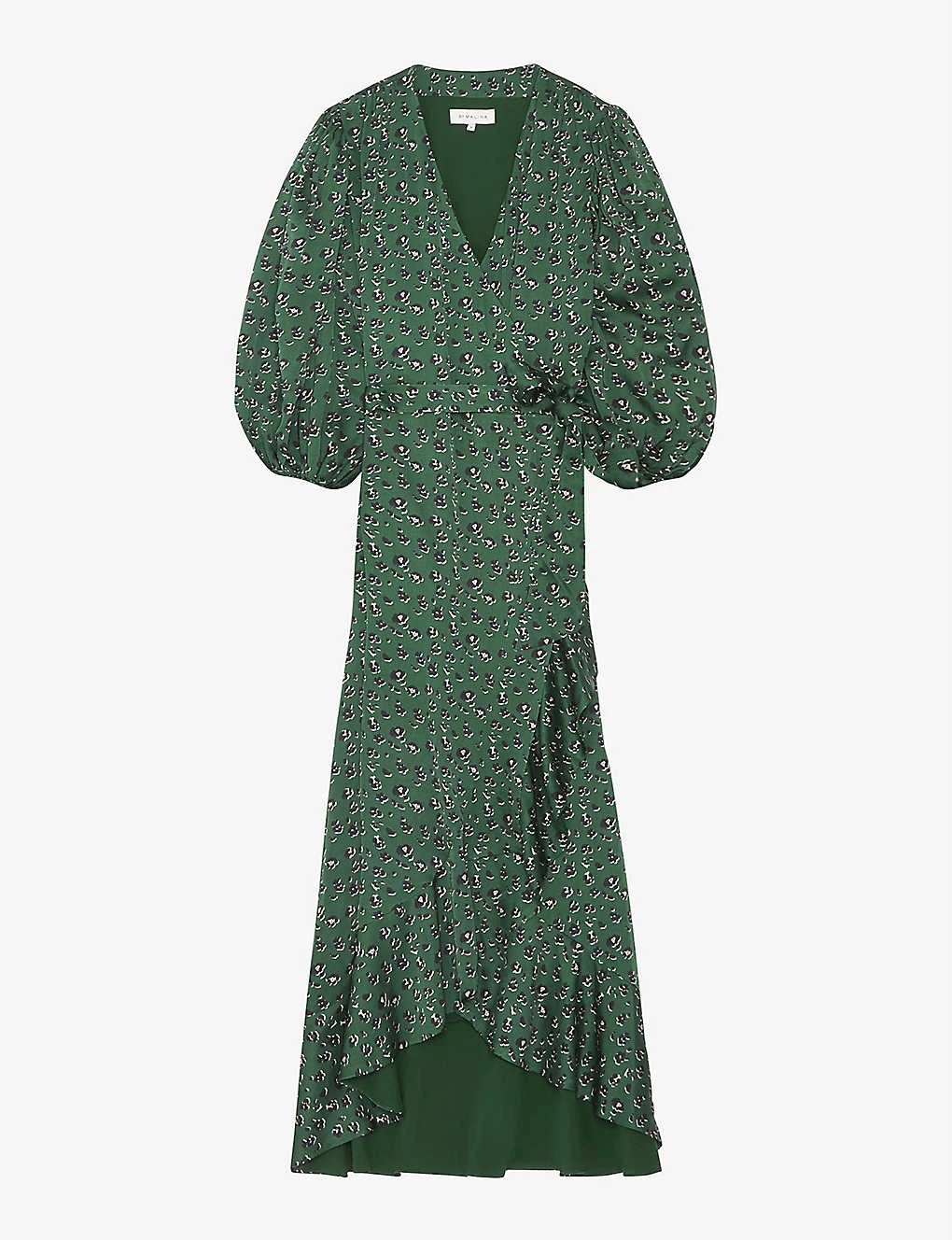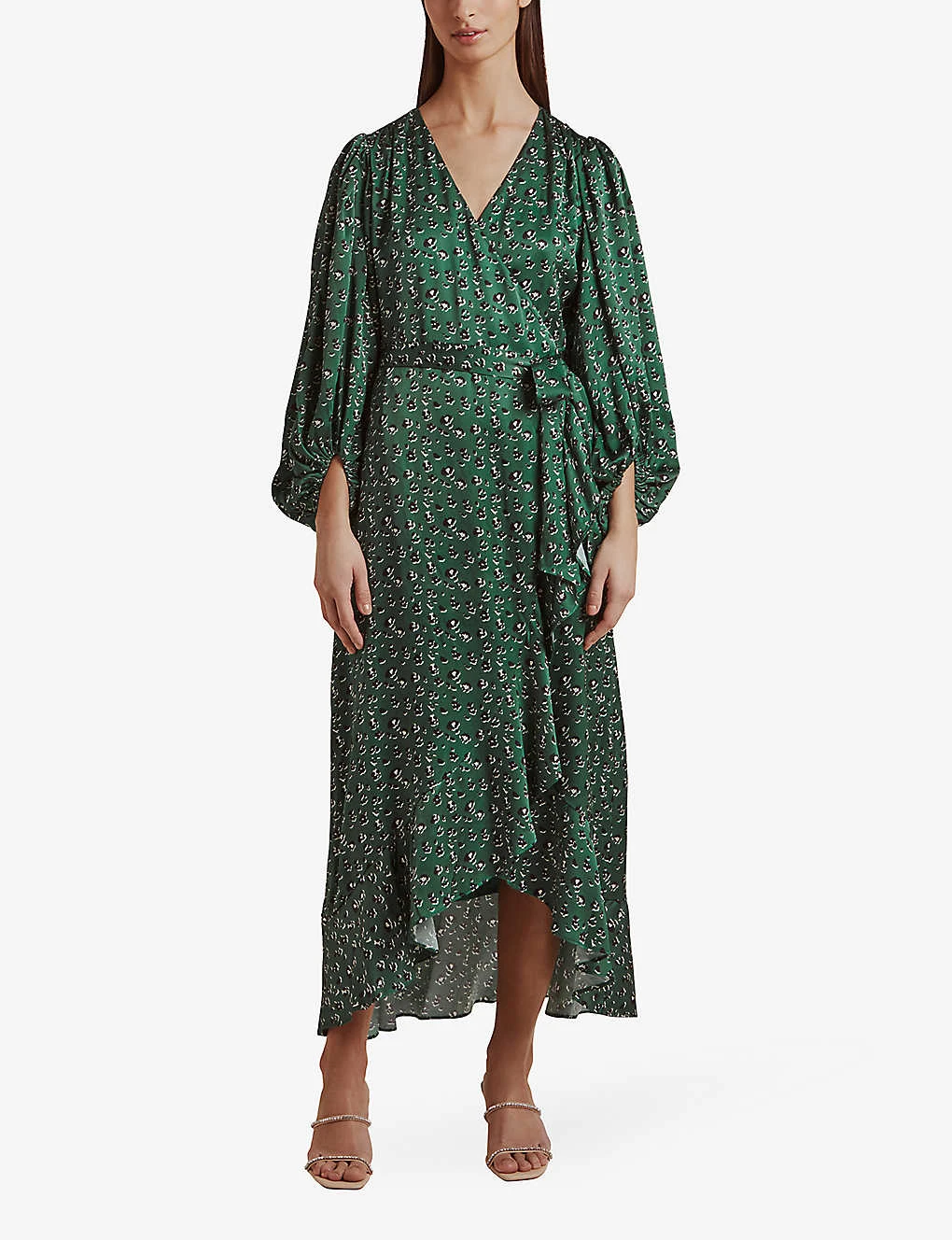 - V neck, long blouson sleeves, all-over print, wrap front, belt at waist, asymmetric hem, ruffled trim, midi length