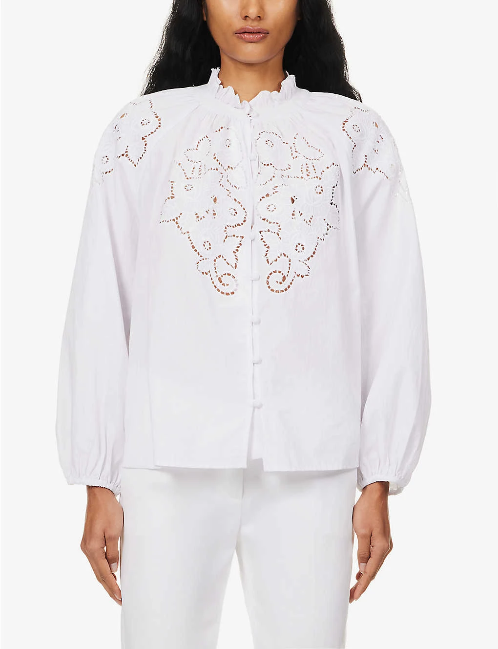 - Relaxed fit, round neckline, ruffle trim at neckline, long puff sleeves, elasticated sleeve hems, floral broderie patches, curved dipped hem