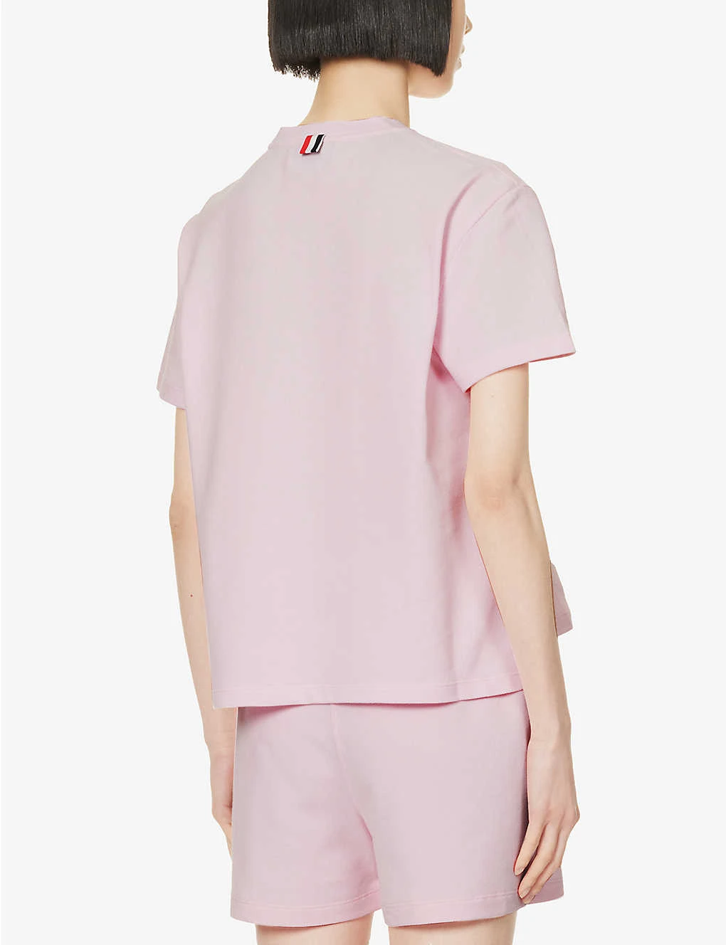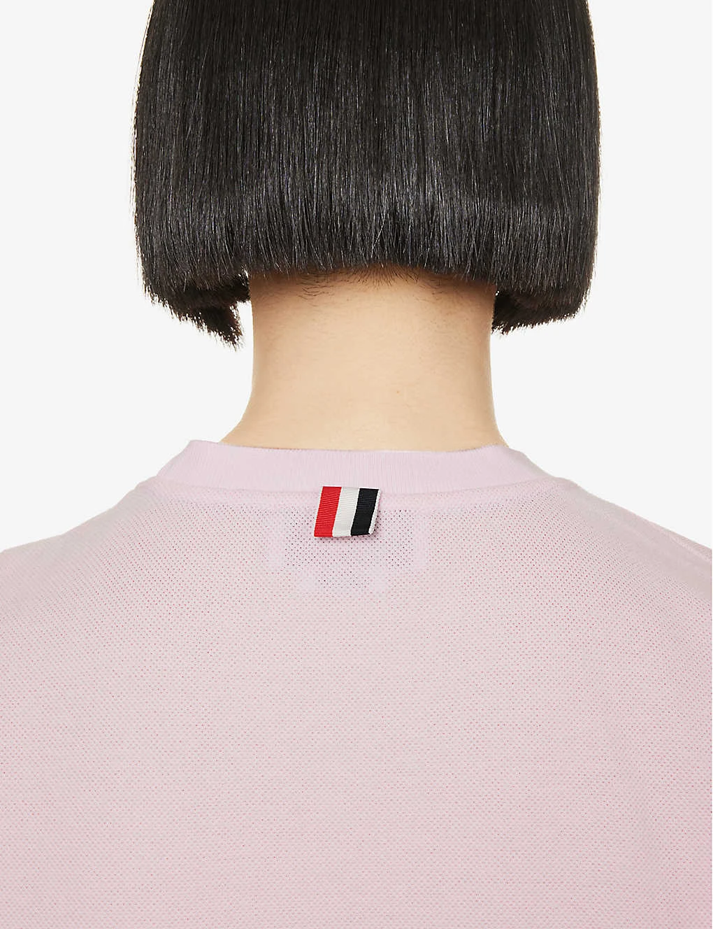 - Relaxed fit, round neckline, ribbed trim at neck, short sleeves, flocked brand appliqué at chest, brand appliqué at front, brand stripe tab at back, all-over piqué texture, split at hem sides, dipped hem