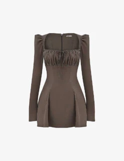 - Close fitting, gathered bust, square neckline, shrug shoulder, long sleeves, adjustable front ties, gathers on bust, godet panels on skirt, fully lined