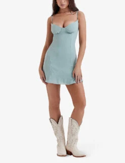 - Non adjustable straps, sweetheart neckline, fitted bodice, internal cups, drawstring at front, gathers on cups, cross lace-up back, side slip hem, lined