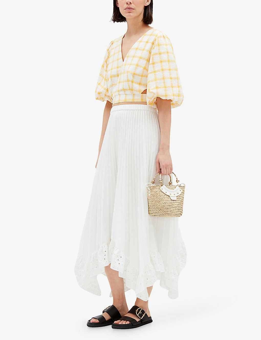 - Mid-rise, elasticated waist, pleat-detail throughout, embroidery trim, asymmetric hem