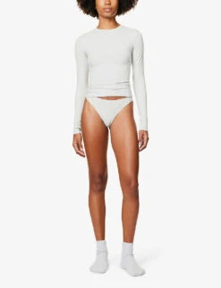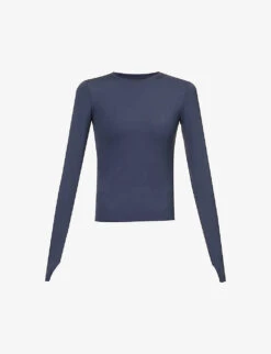 - Fitted, round neck, ribbed trim at neck, long sleeves, thumbhole cuffs, branded print at back