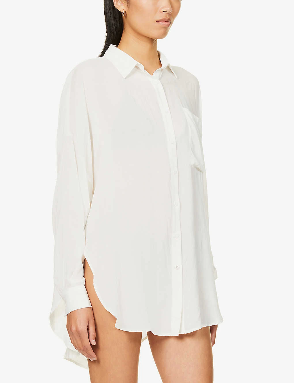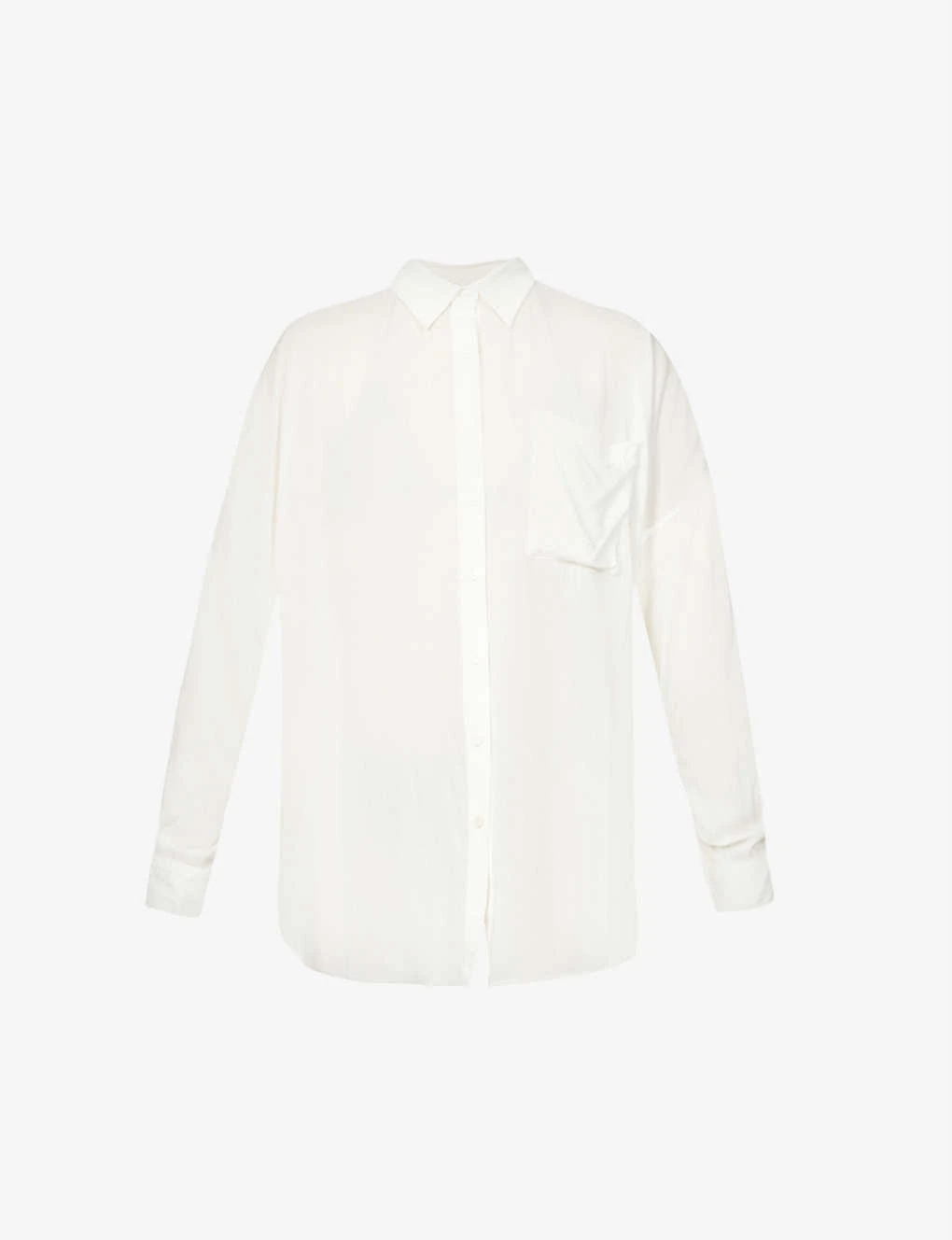 - Collar dropped shoulders, long sleeves, buttoned cuffs, patch pocket at chest, semi-sheer, all-over woven texture, box-pleat at back yoke, split sides, dropped at back, curved hem