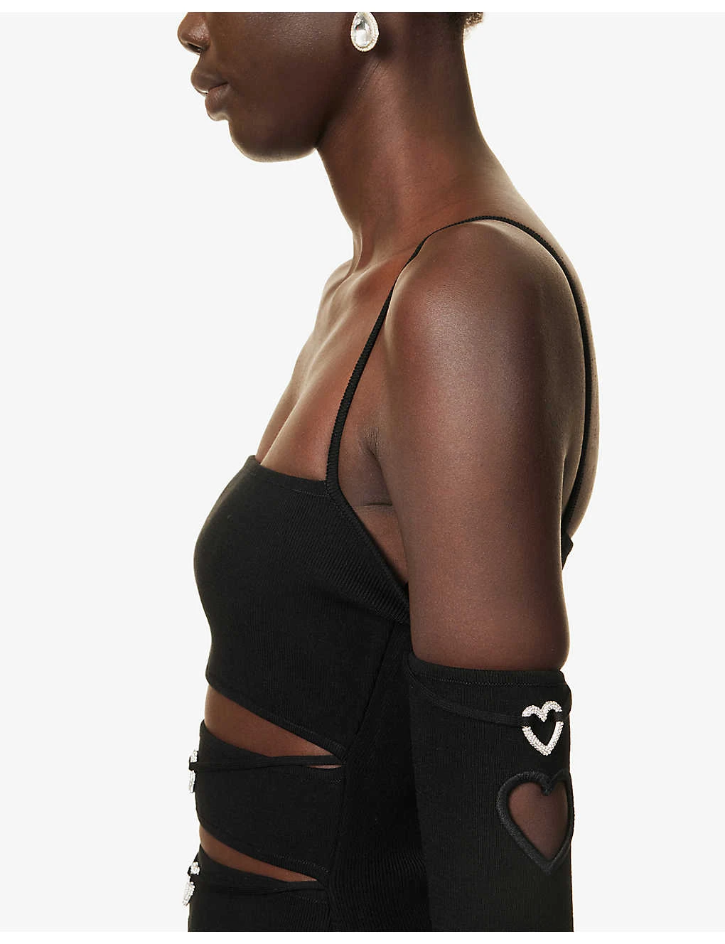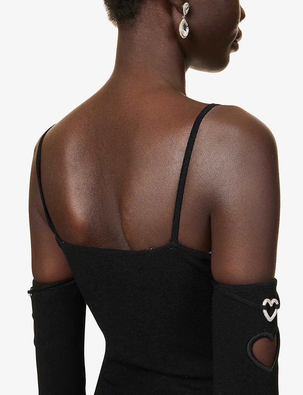 - Slim fit, square neckline, exposed shoulders, long flared sleeves, heart cut-out panels, embellished heart charms, medium knit, ribbed texture
