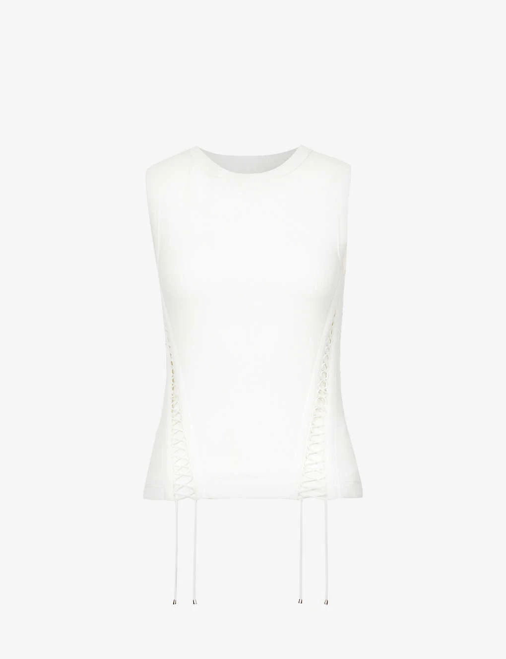- Slim fit, round neck, sleeveless, boning at front, two lace-up panels at front, ribbed weave, ribbed trims