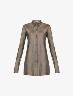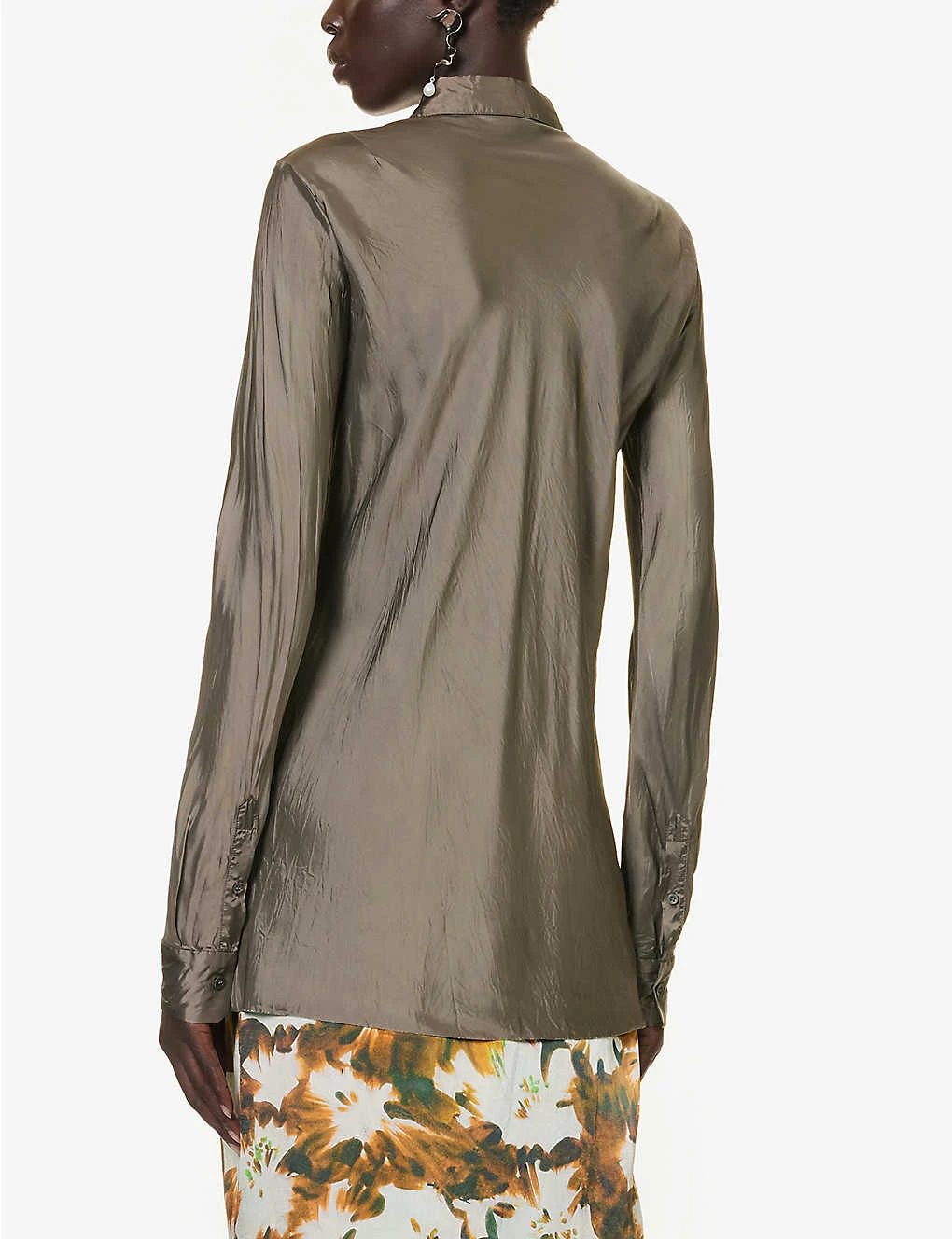 - Slim fit, collar, long sleeves, buttoned sleeve hems, pearlescent buttons, soft crease texture, longlined