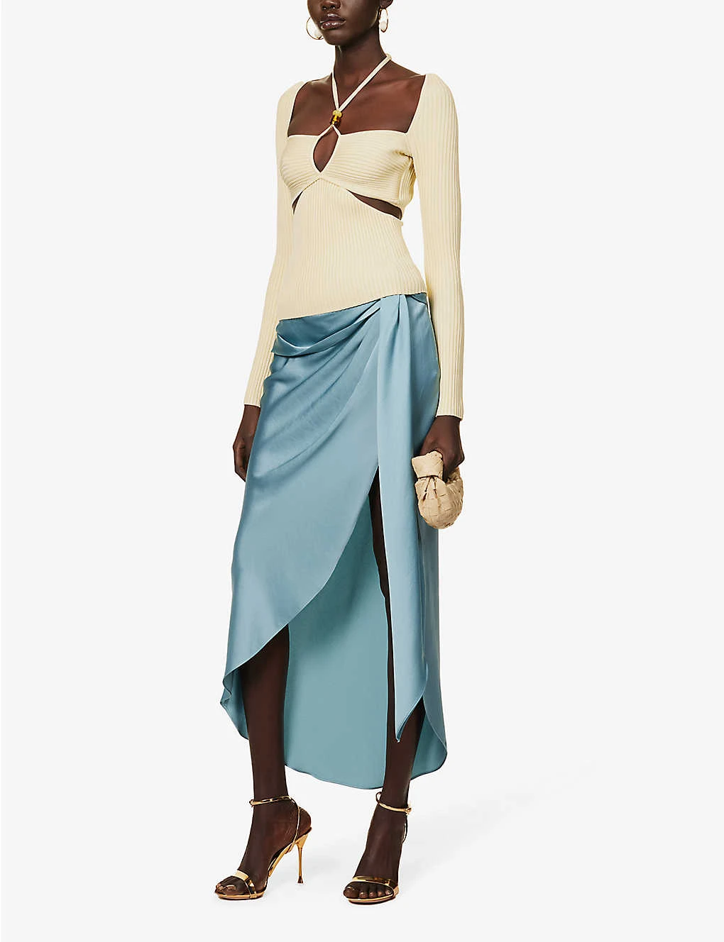 - Regular-fit, high-waist, tie-knot at front, all-over satin texture, draped panel at side, asymmetric hem