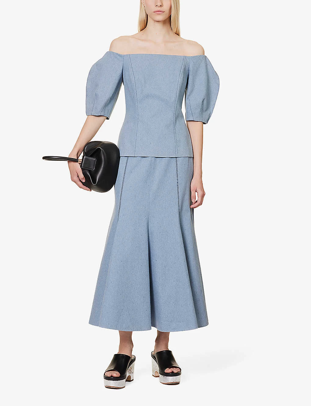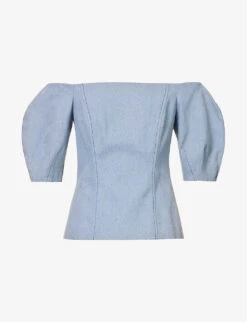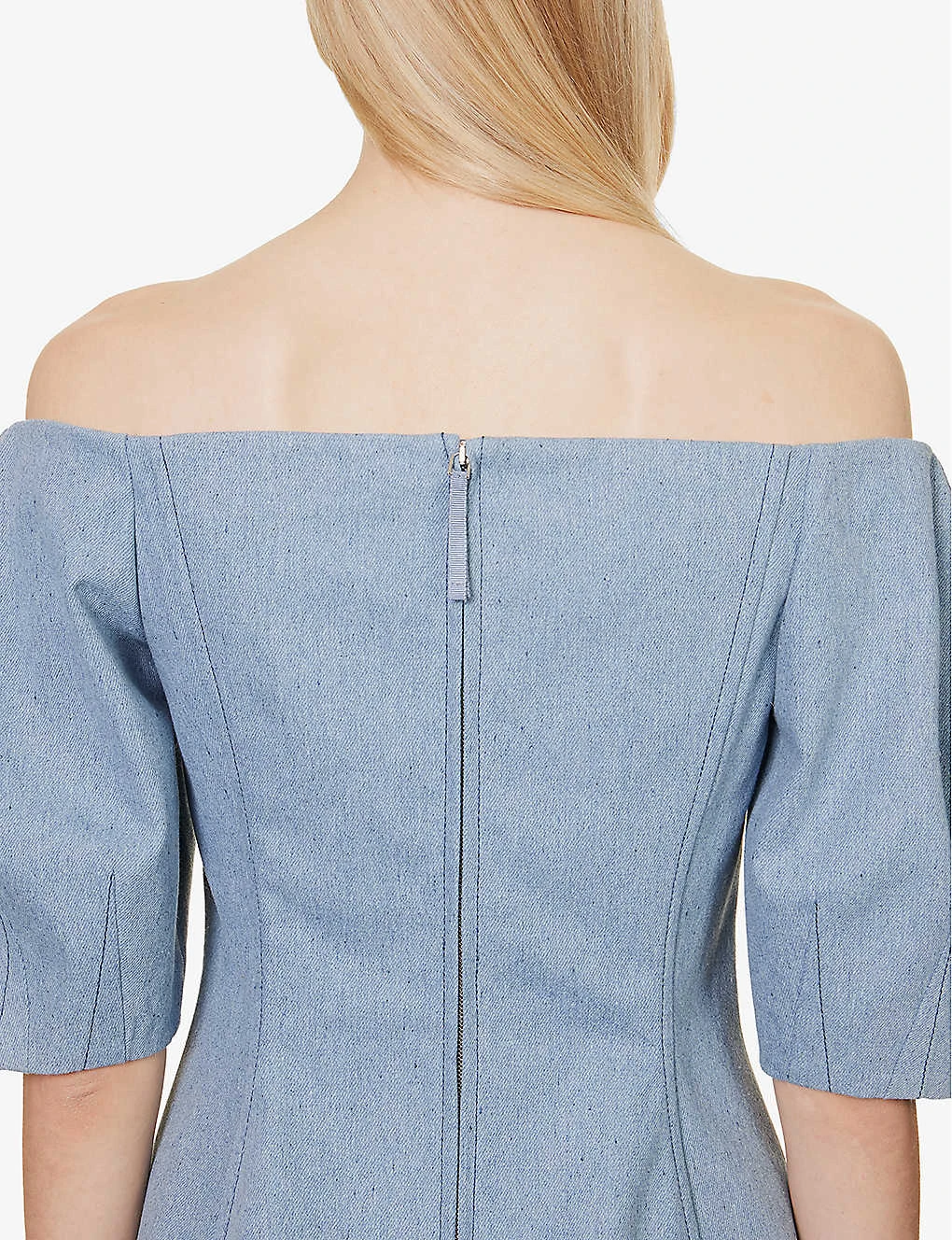 - Slim fit, straight-across neckline, off-the-shoulders, puffed sleeves, straight cuffs, all over denim texture, fully lined, flared hem