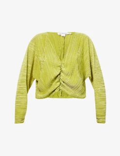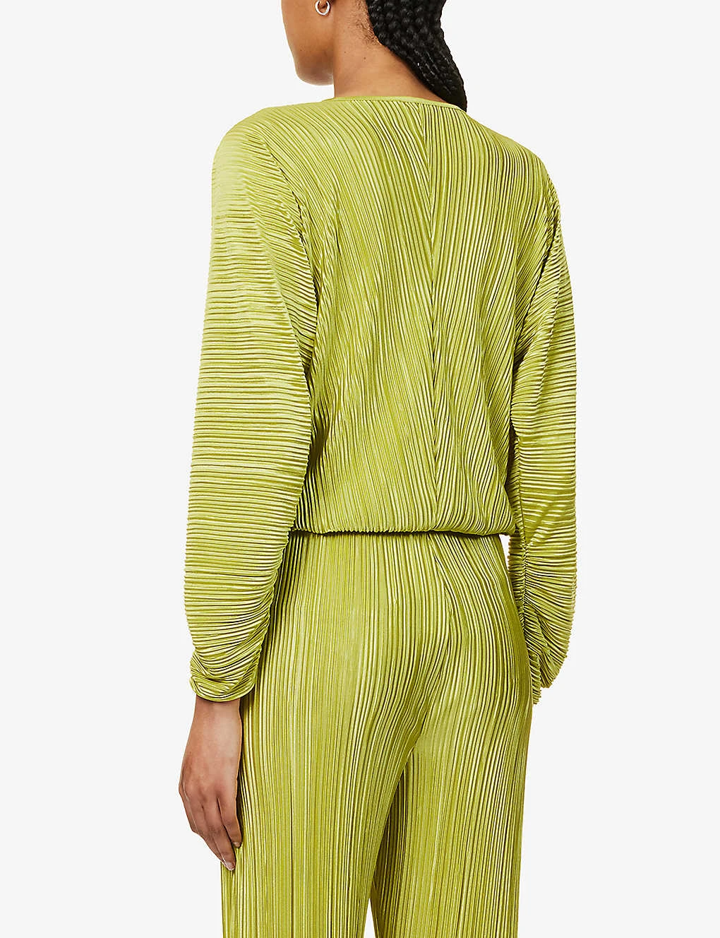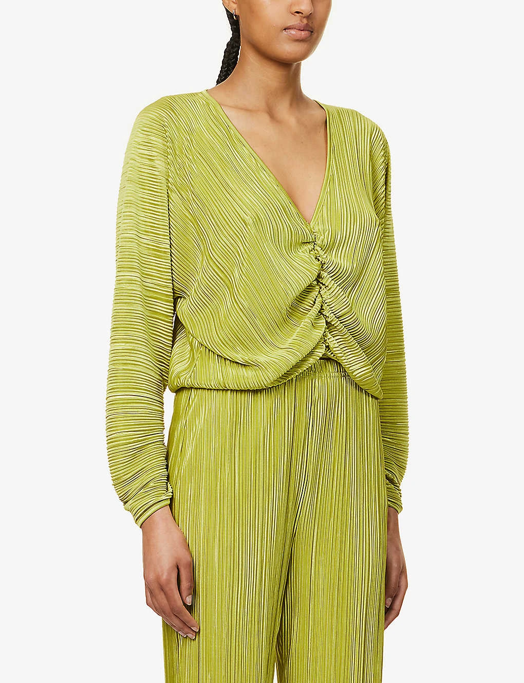 - Relaxed fit, plunge V-neckline, long batwing sleeves, ruched pattern at sleeves and at front, all-over textured pleat pattern