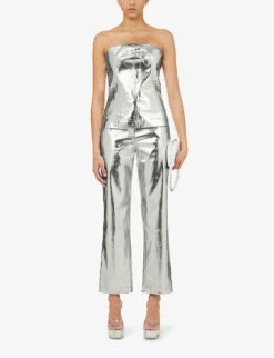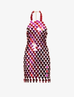 - Slim fit, halterneck, all-over heart shaped sequin discs, open at back, gold-toned hardware