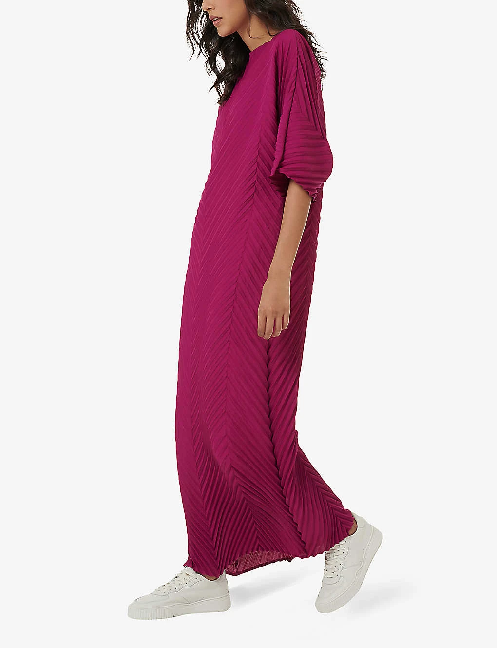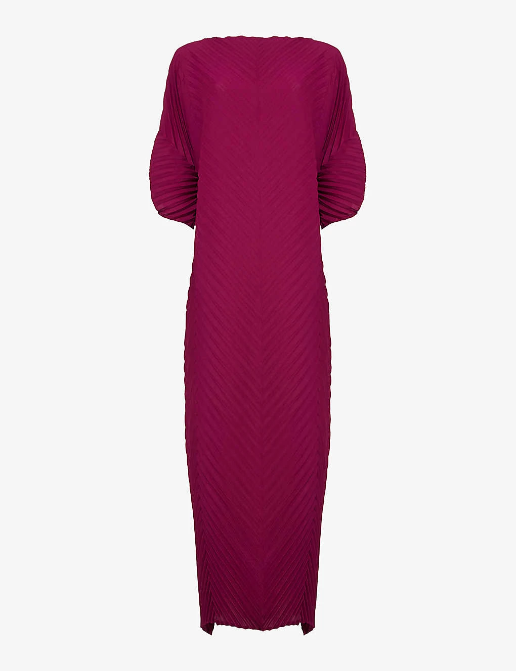 - Relaxed fit, 3/4-length sleeves, boat neck, maxi length, all-over herringbone plissé finish