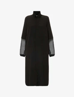 - Regular fit, high neck, long sleeves, ribbed sleeve hems, patch pocket at chest, layered design, partially sheer with soft crease texture, split at hem sides
