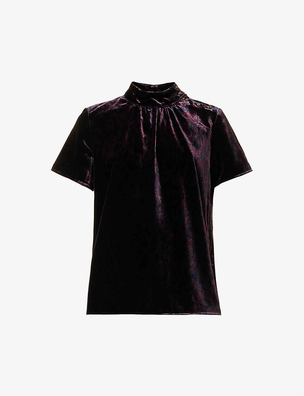 - Regular fit, high neck, short capped sleeves, brand metal plaque at back, abstract pattern, velvet texture