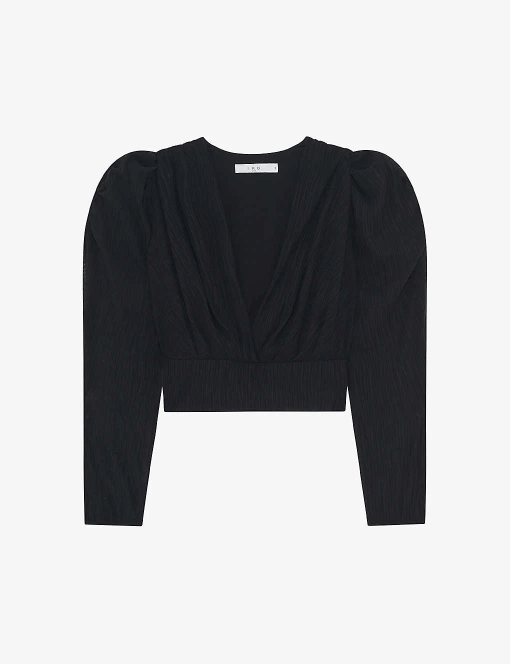 - Plunge V-neckline, long puffed sleeves, panel waistband, cropped design