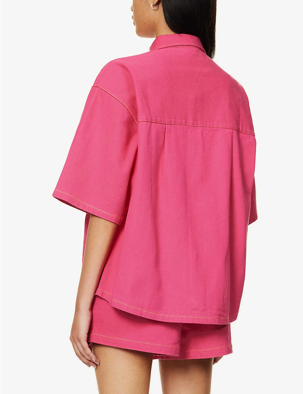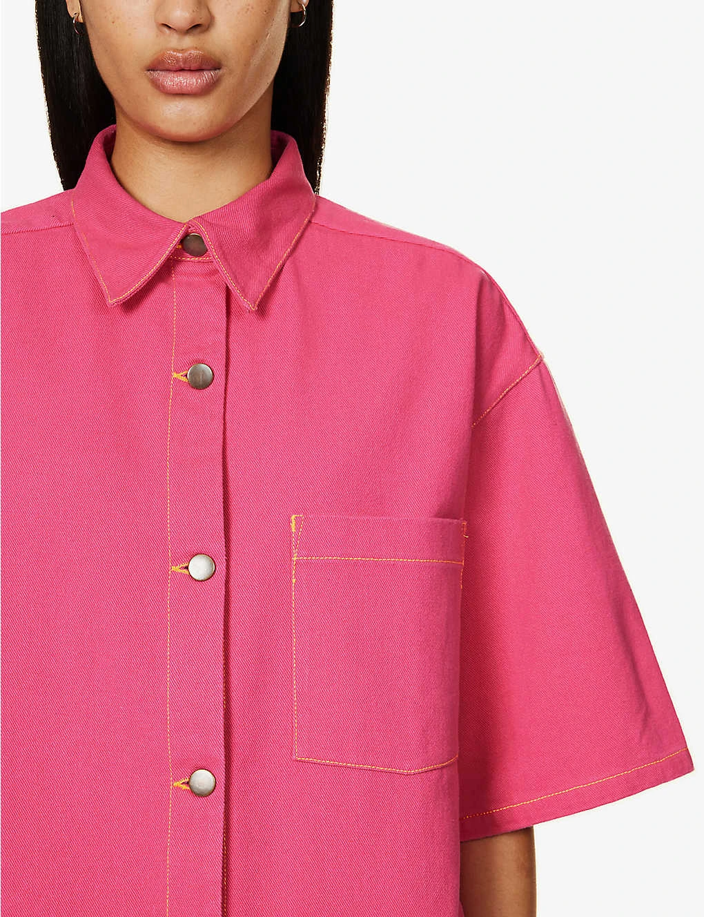 - Boxy fit, collar, dropped shoulders, short sleeves, patch pocket at chest, contrast stitching, pleated yoke