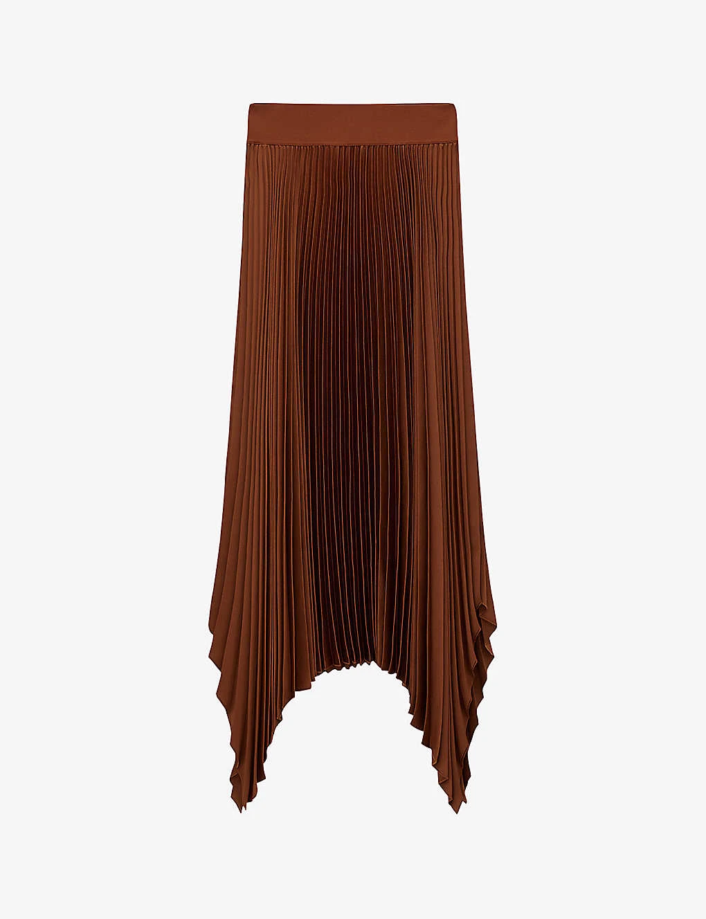 - Regular fit, high rise, elasticated waistband, midi length, asymmetric hem, pleated