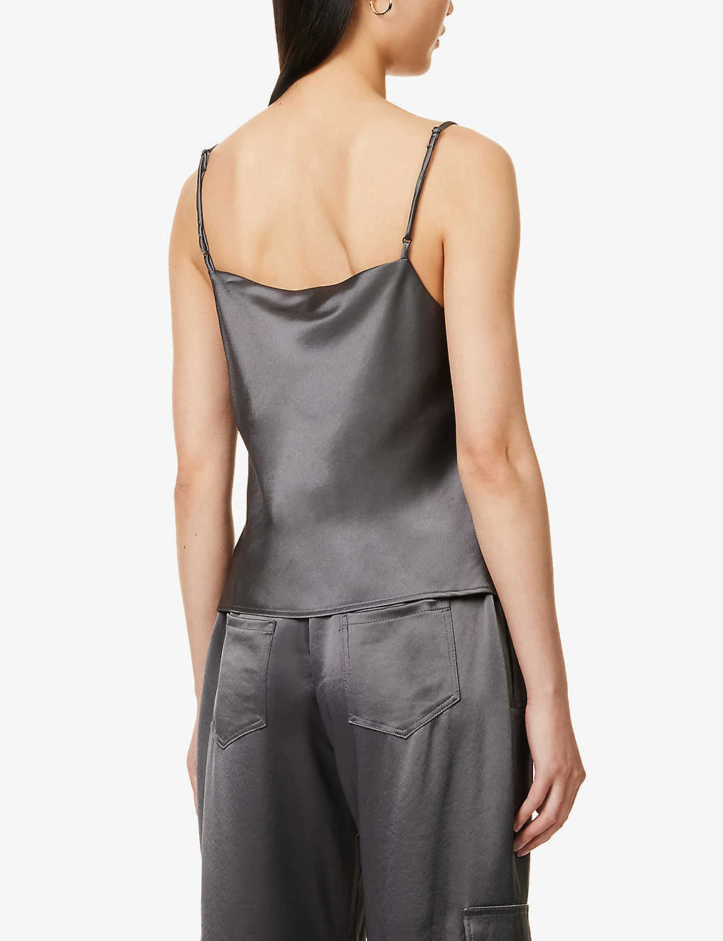- Relaxed fit, straight-across neck, adjustable shoulder straps, satin finish