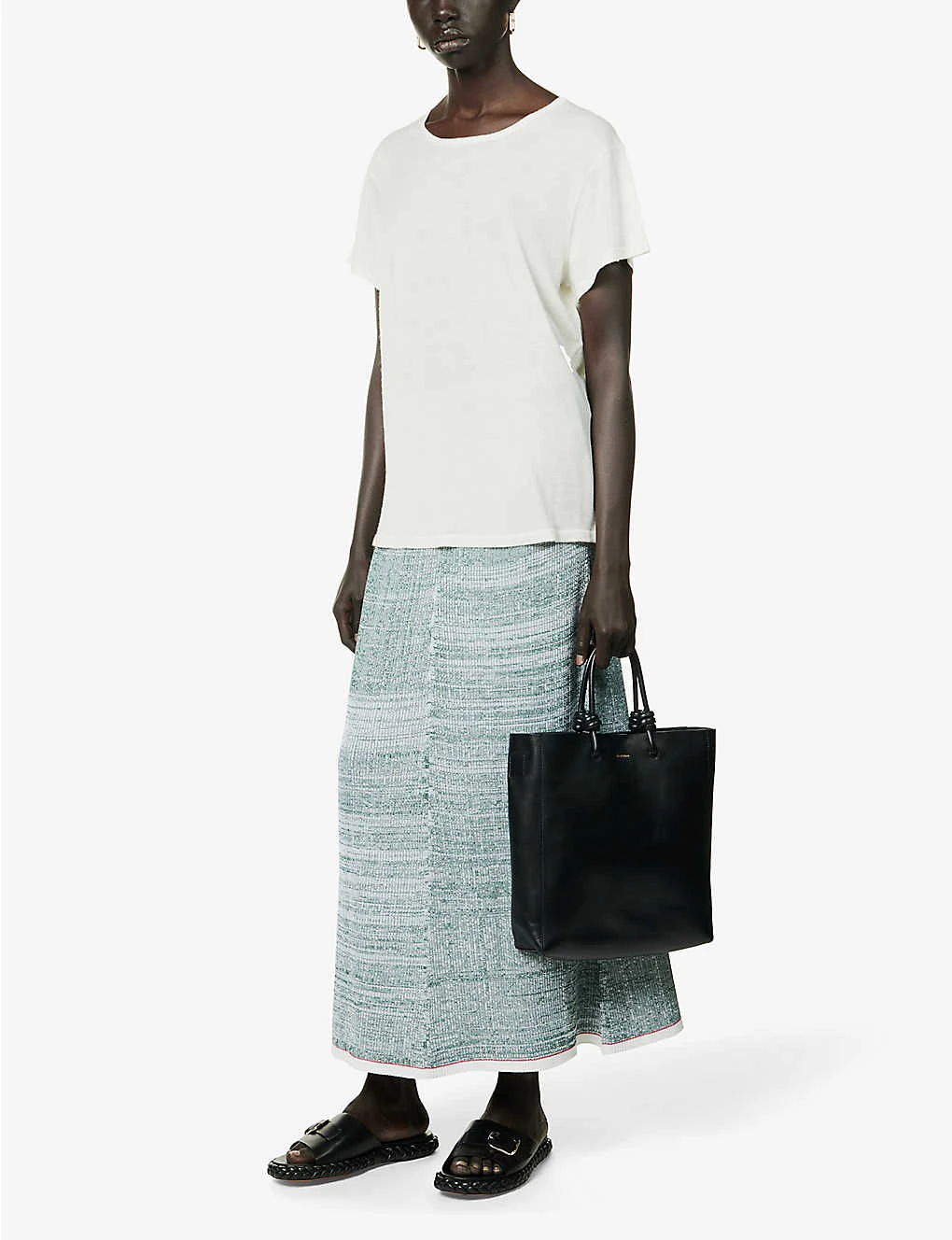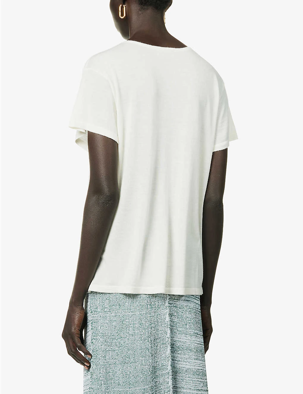 - Relaxed fit, round neckline, short sleeves, fine knit