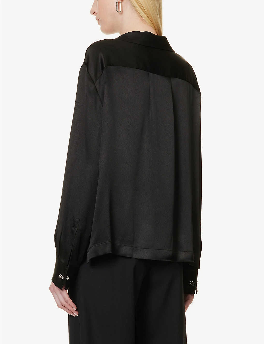 - Relaxed fit, notched collar, long sleeves, buttoned sleeve hems, patch pocket at chest, brand monogram embroidery at chest, straight yoke with pleat at back, branded buttons, satin texture