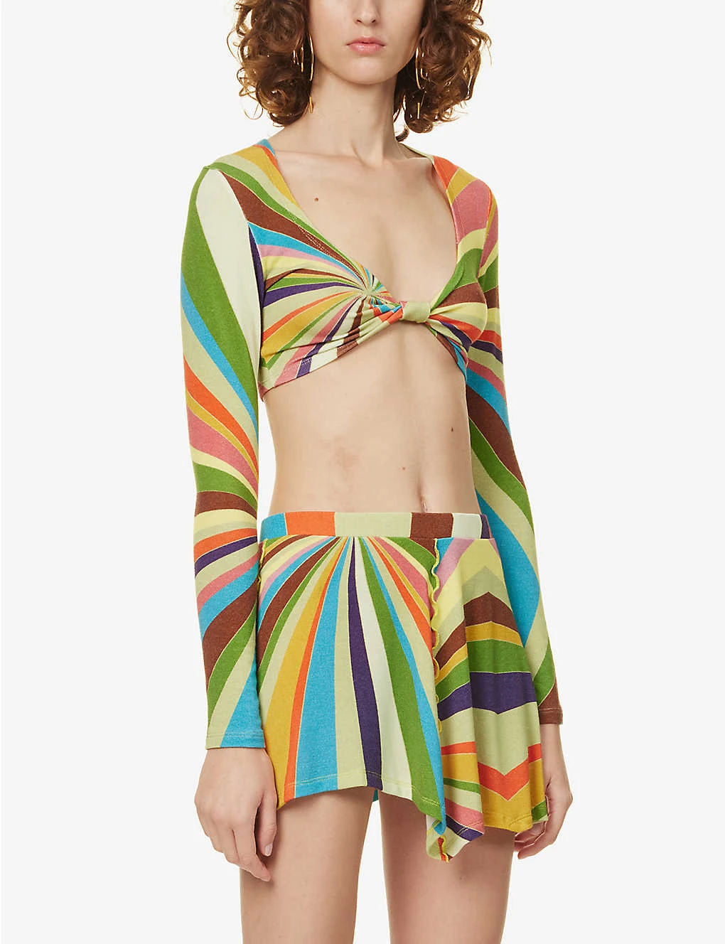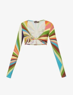 - Regular-fit, V-neck, long sleeves, knotted at front, all-over geometric pattern, cropped