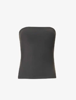- Fitted, straight-across-neck, strapless, detachable padding, brand print at back, supportive interior, lining
