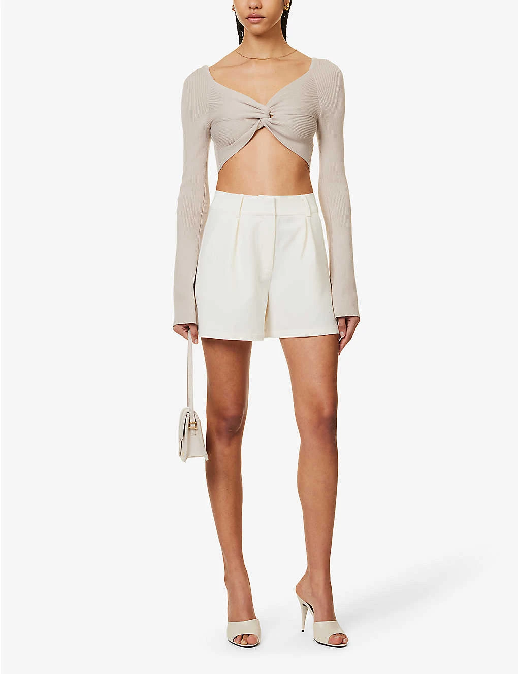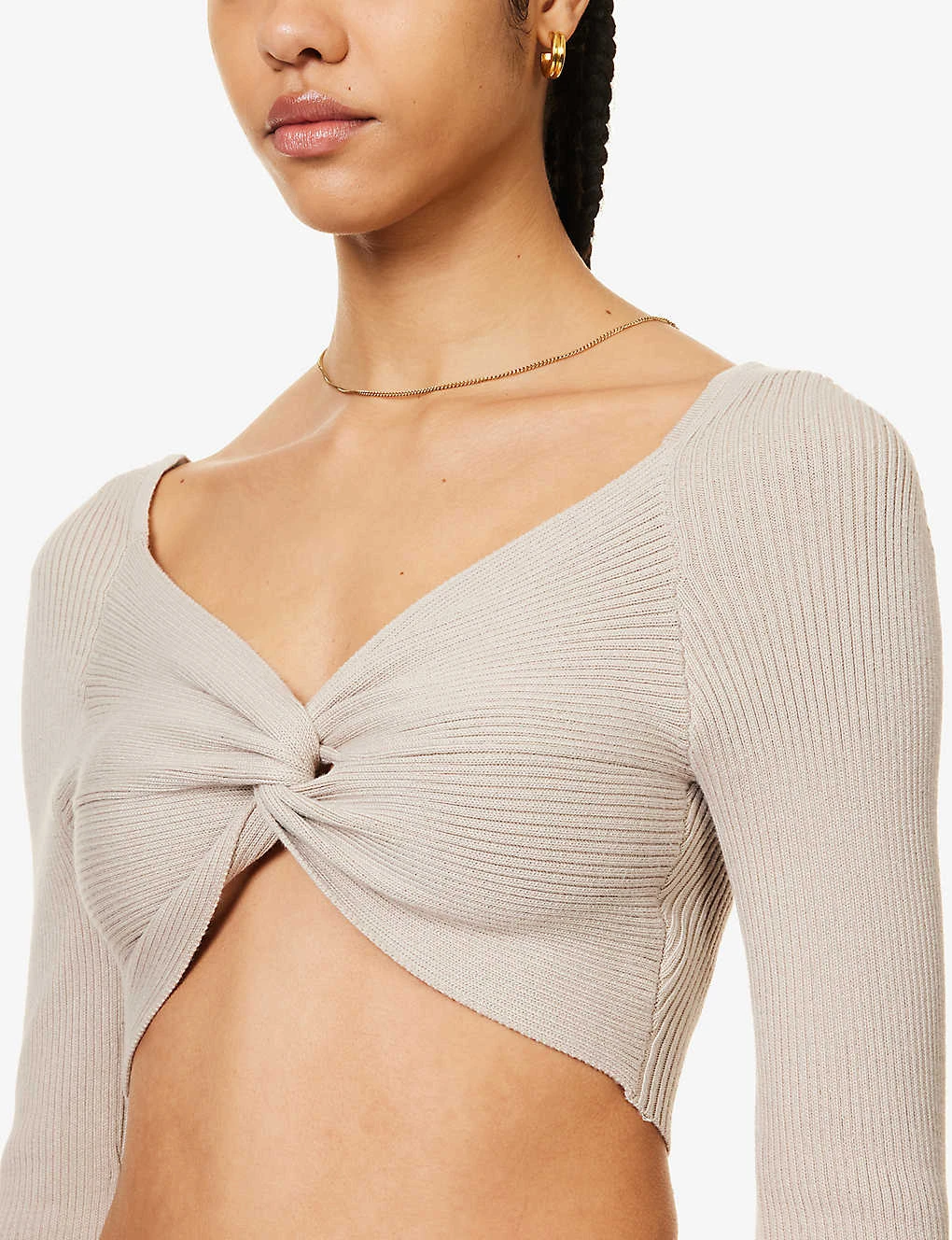 - Regular-fit, V-neck, twist-knot at front, long sleeves, all-over ribbed texture