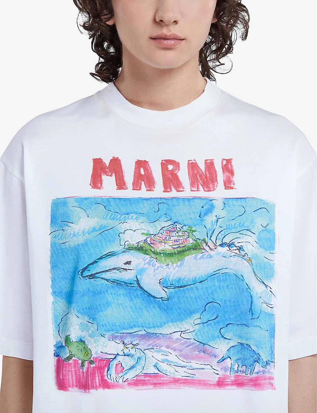Boxy fit, crewneck, ribbed trim at neck, dropped shoulders, short sleeves, graphic brand print at front