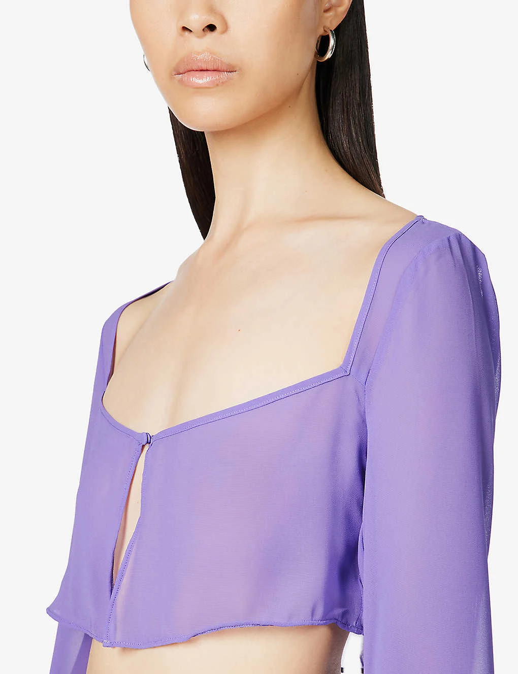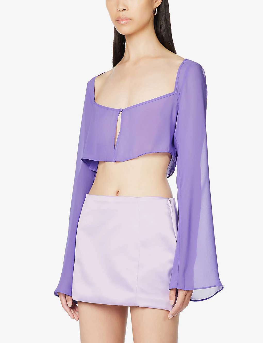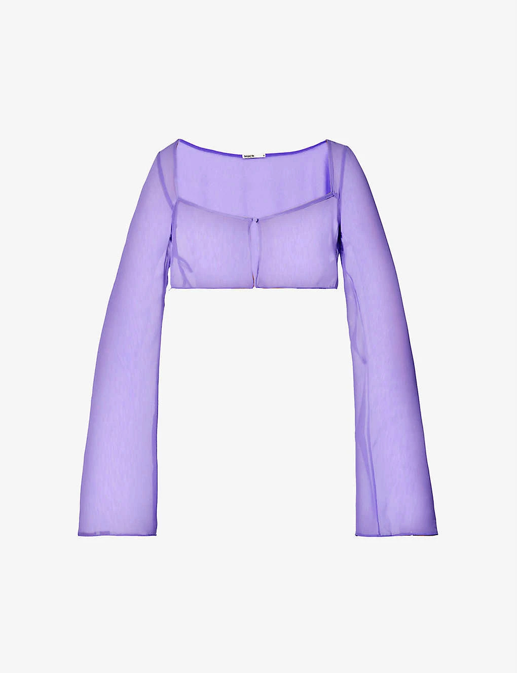 - Slim fit, sweetheart neckline, long flared sleeves, split at front, sheer, V-hem, cropped