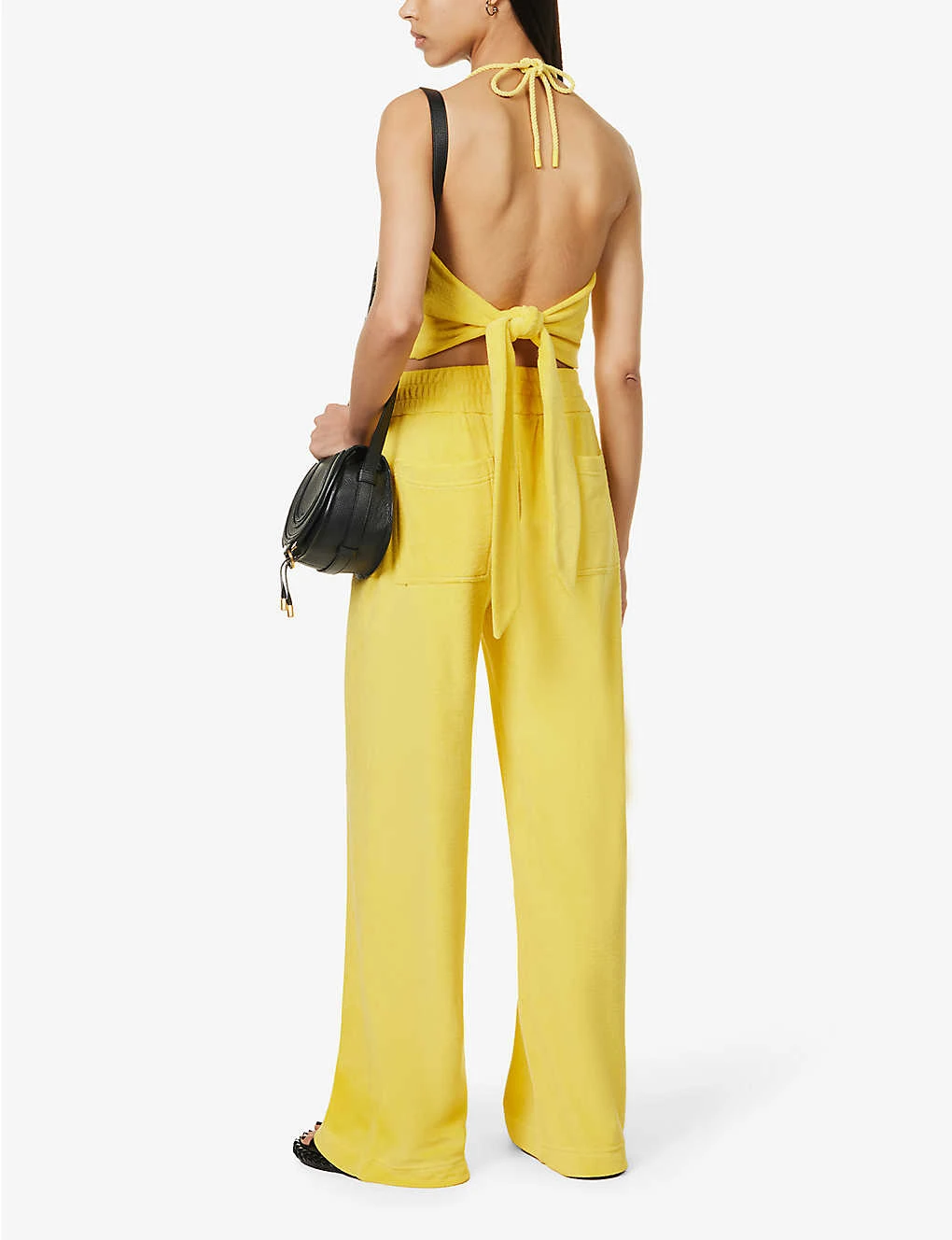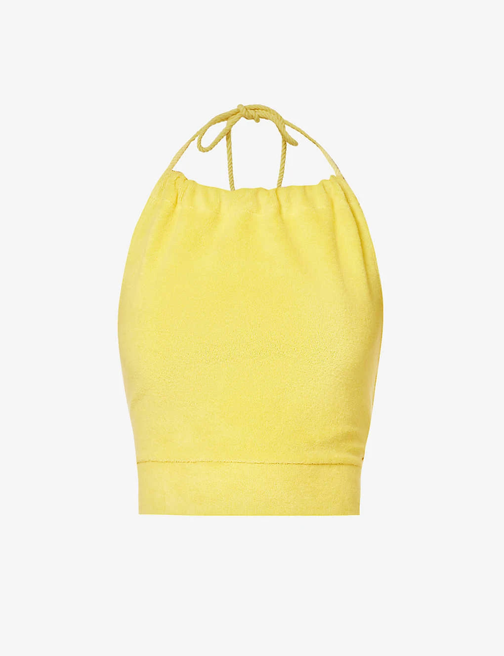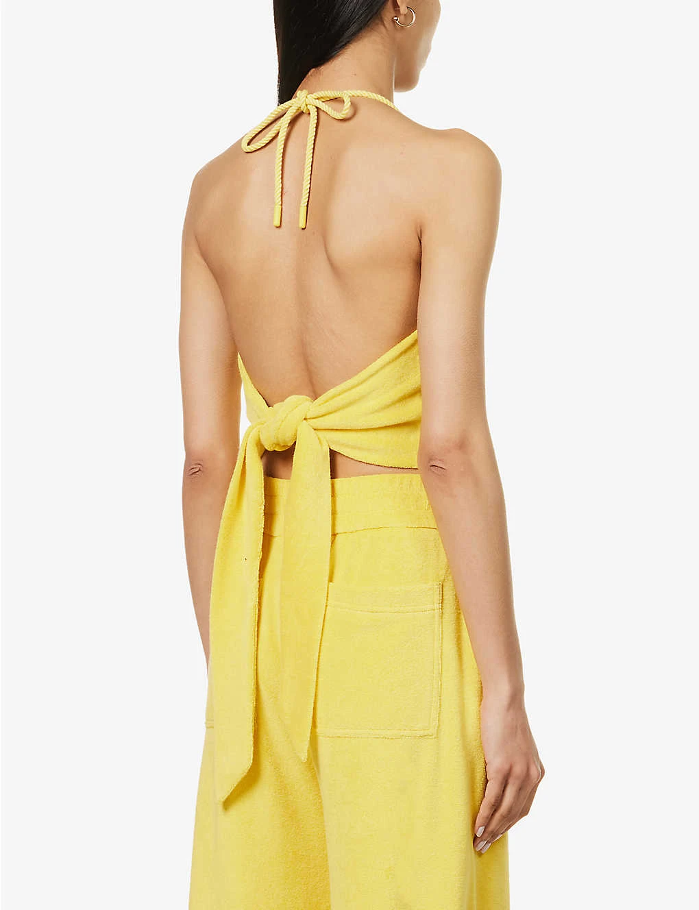- Regular fit, halterneck, sleeveless, self-tie drawstring at neck, open back, all-over towelling texture, cropped