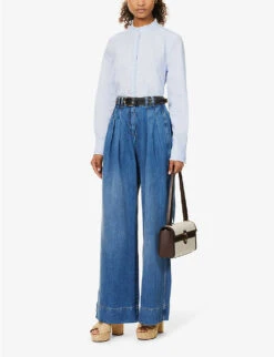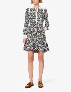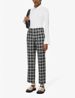 - Regular fit, mid-rise, structured waistband, abstract geometric pattern, pleated flared hem