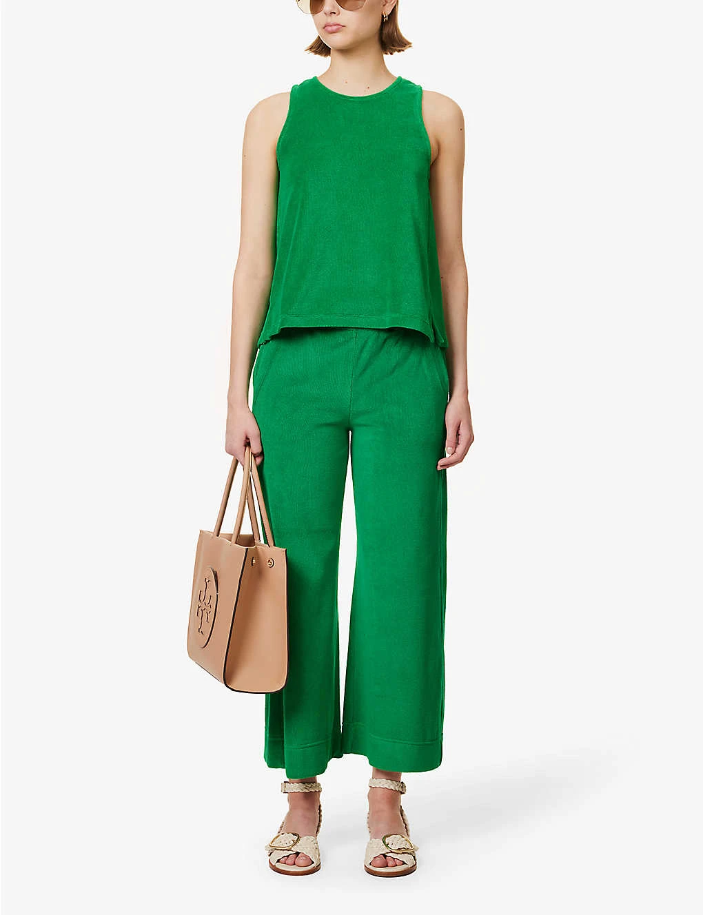 - Regular-fit, scoop neck, shoulder straps, all-over towelling texture, trapeze silhouette, notched hem