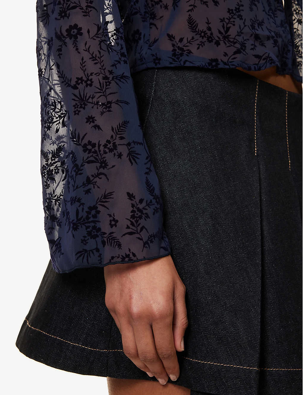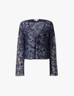 - Regular-fit, V-neck, long bell sleeves, semi-sheer, all-over velvet floral pattern,