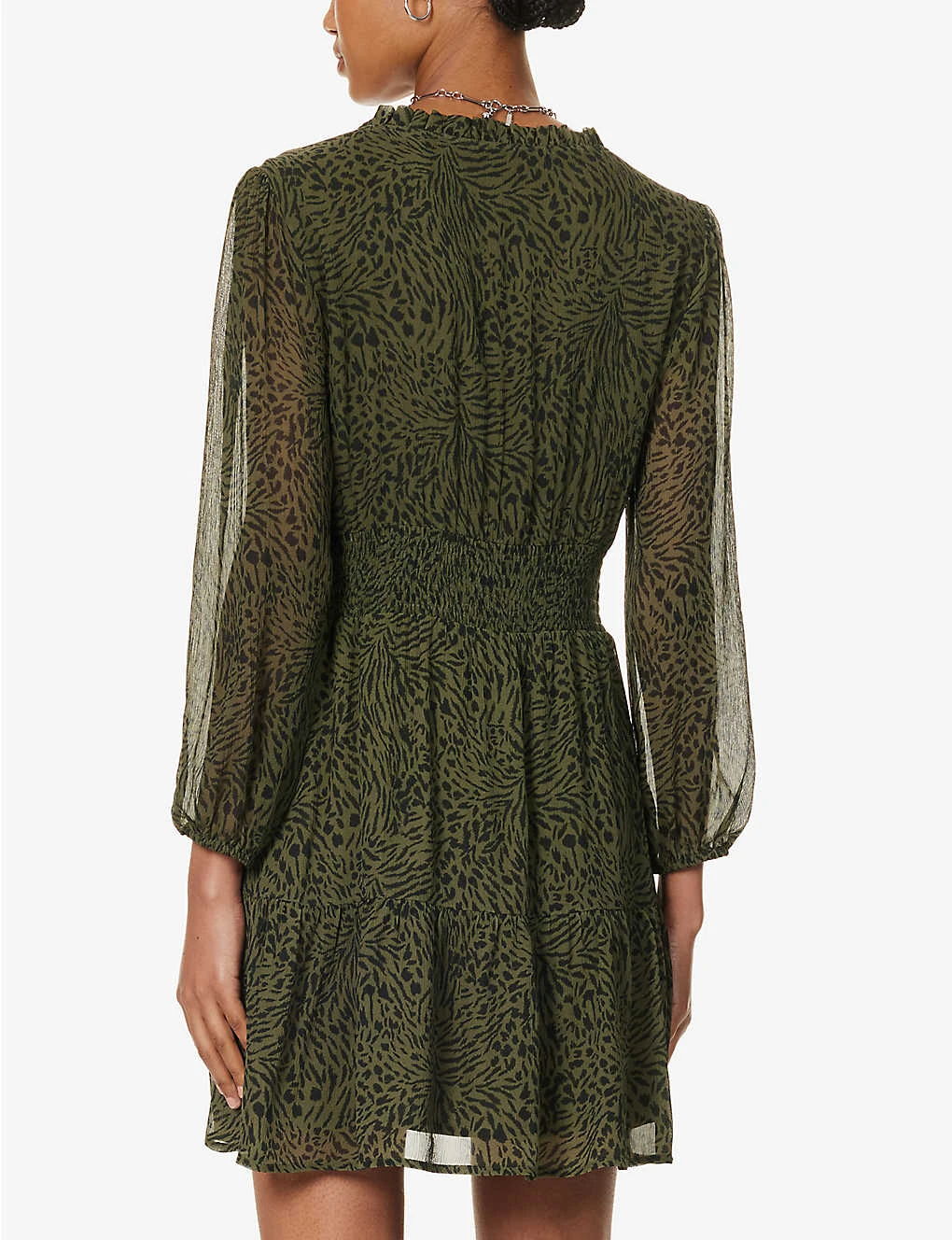 - Regular fit, V-neckline, long sleeves, elasticated cuffs, shirred panel at waist, tiered hem, all-over print, lined