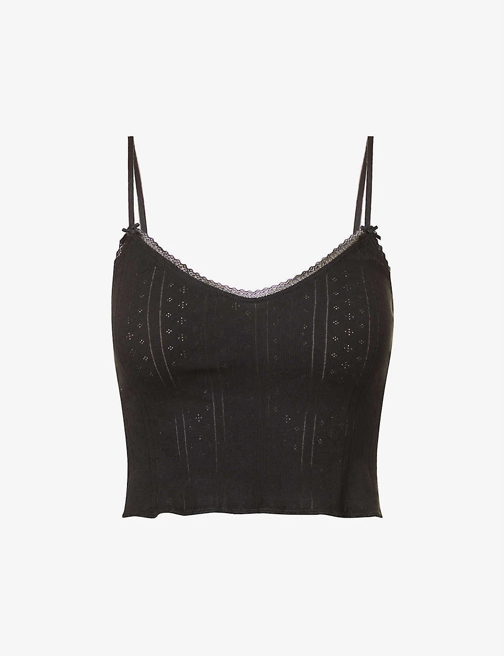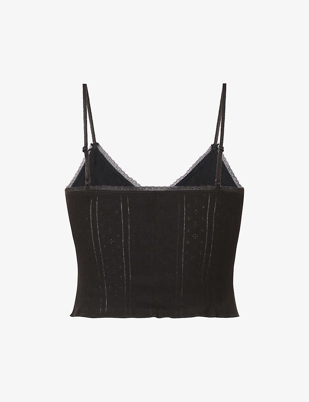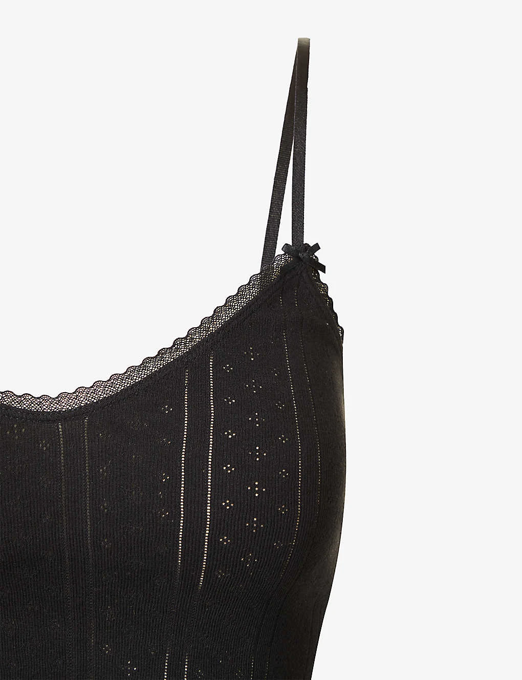 - Fitted, cropped, V-neck, adjustable shoulder straps, all-over fine knit, lace trims