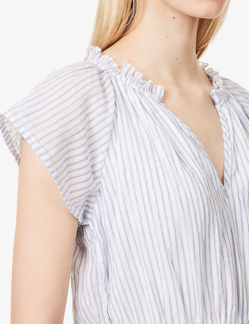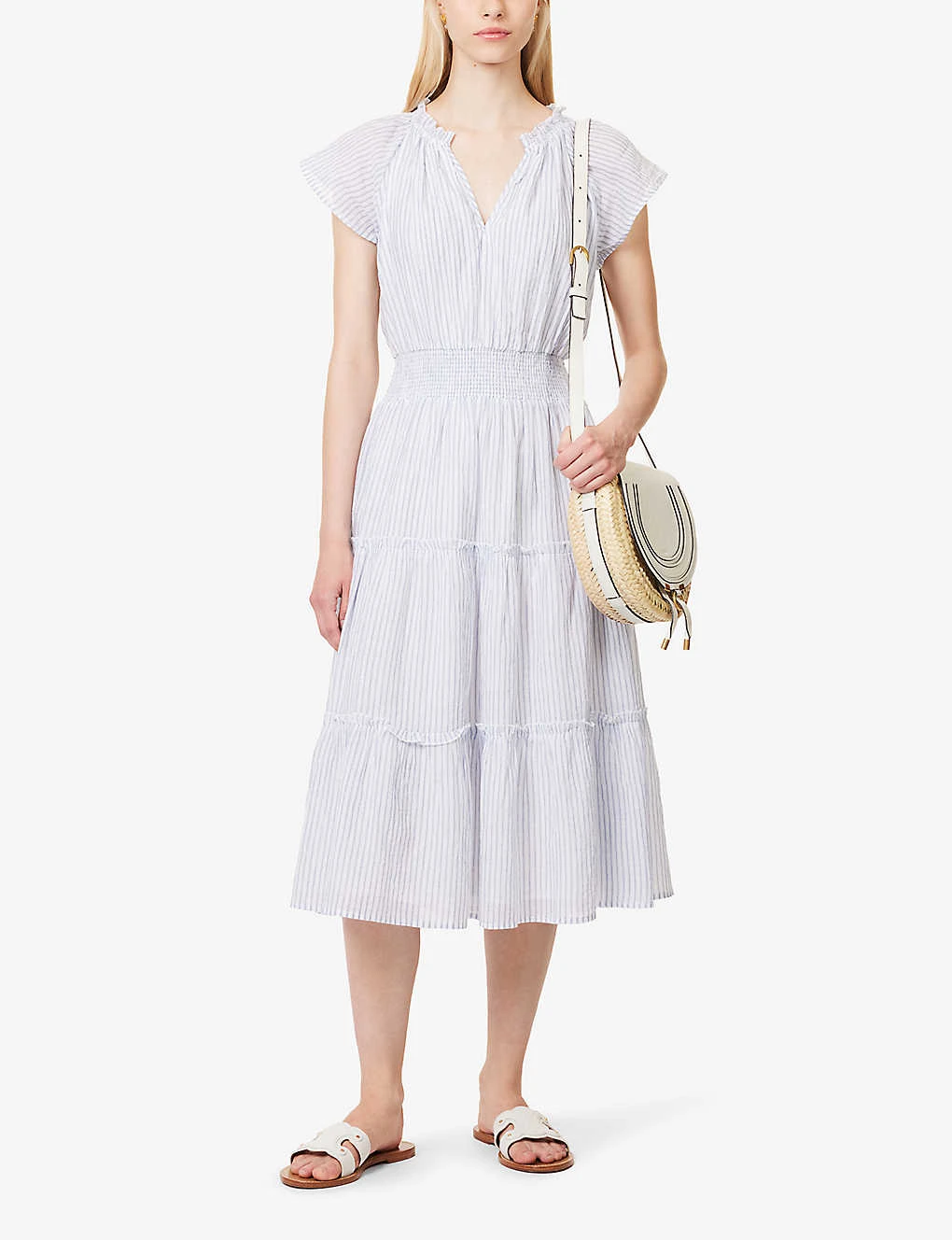 - Regular fit, V-neckline, short flutter sleeves, shirred elasticated waistband, all-over stripe pattern, tiered flared hem