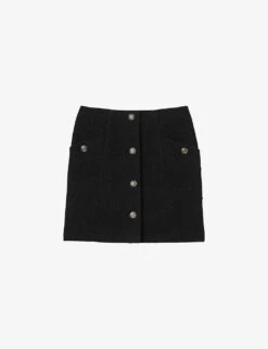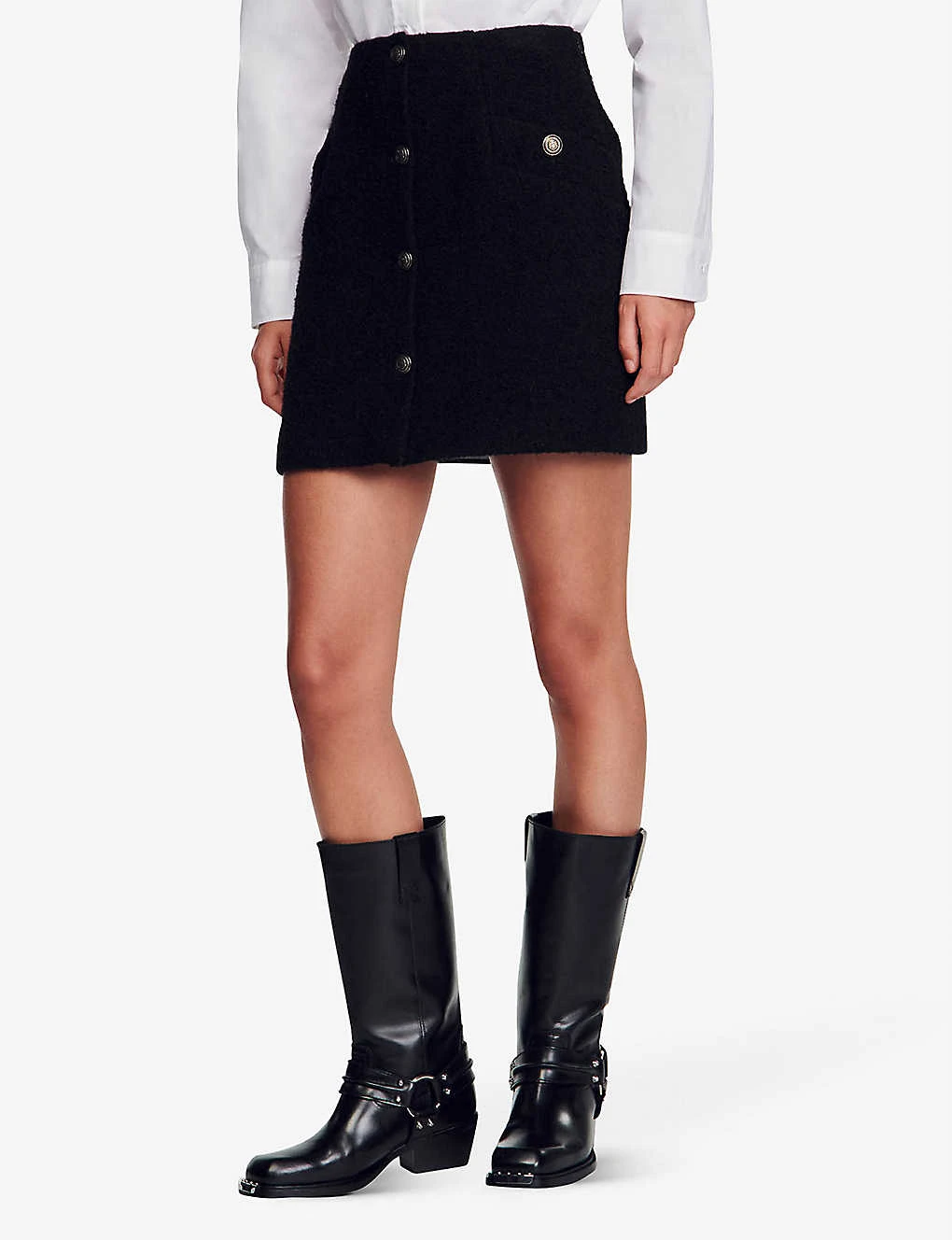 - High rise, button-embellishment at the centre, boucle style, mini silhouette