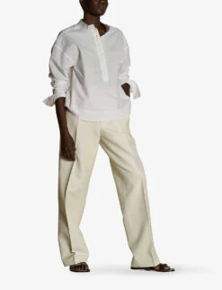 - Relaxed fit, long sleeves, mock neck, mid length, tied waist, removable belt two chest patch pockets, all-over graphic geometric print