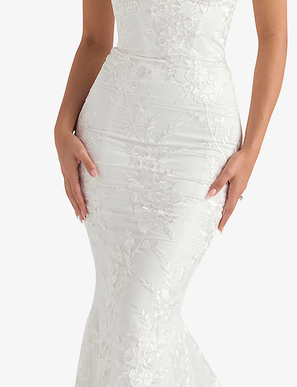 - Slim fit, sweetheart neckline, underwired cups, sleeveless, thin shoulder straps, corset bodice, train at back, all-over floral lace overlay, A-line silhouette, scallop hem
