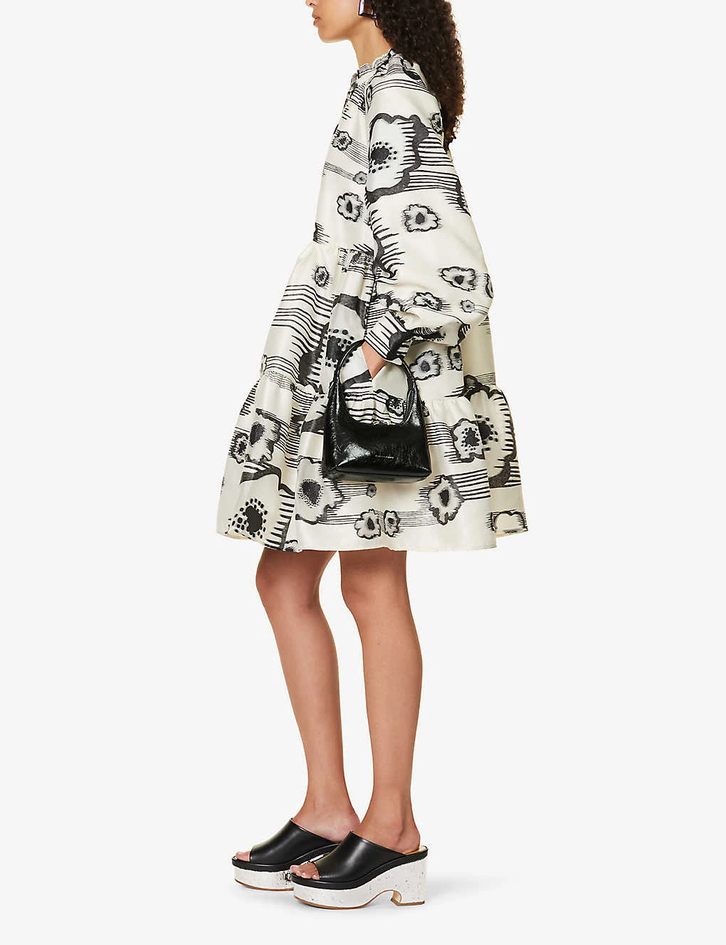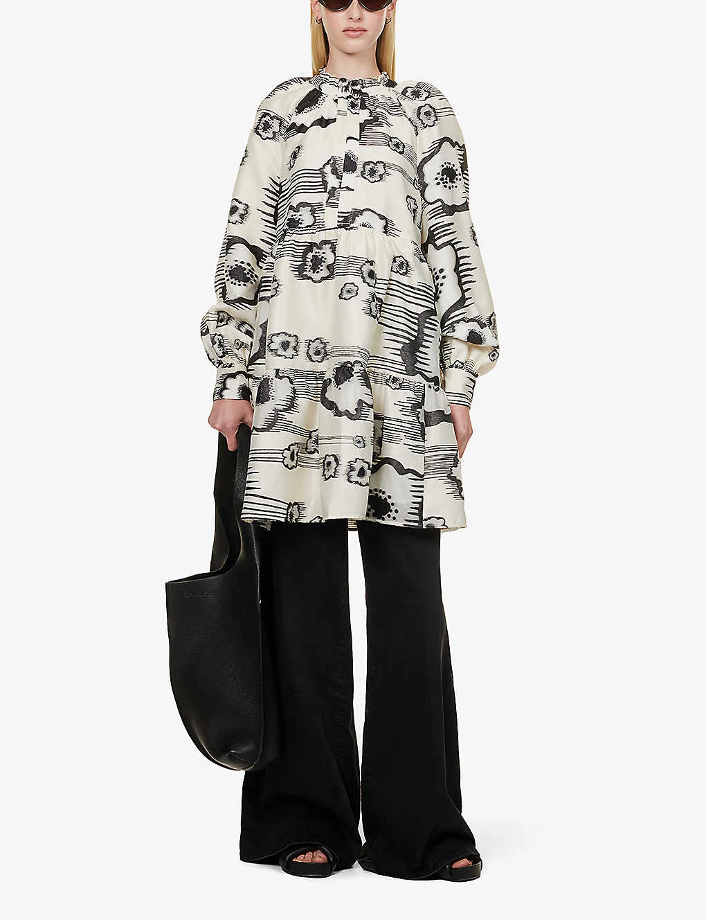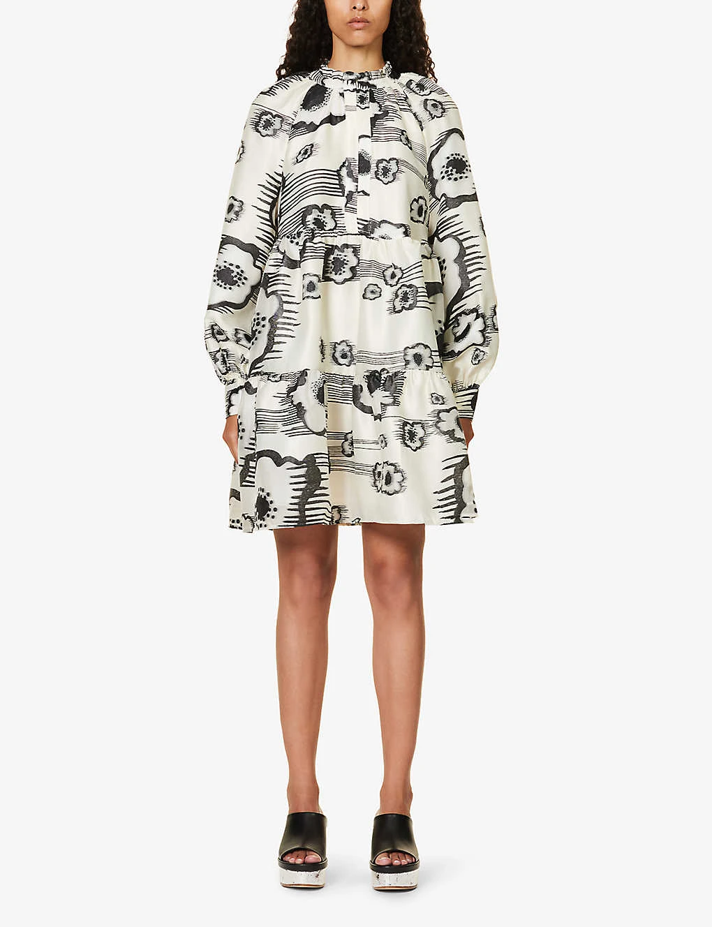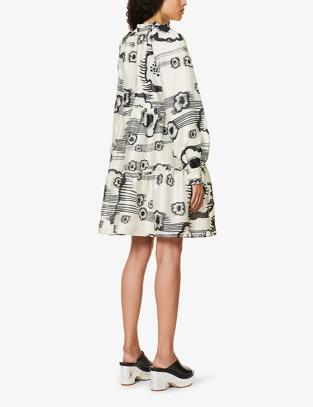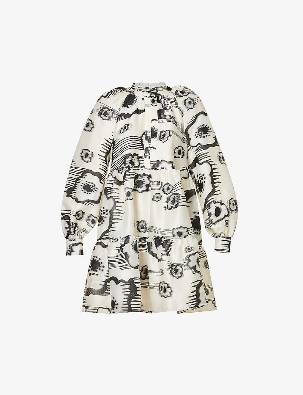 - Regular fit, high neck, long sleeves, buttoned sleeve hems, gathered at waist, two slip pockets at front, abstract pattern, tiered flared hem, lined