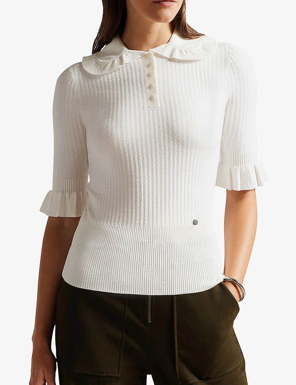 - Slim fit, short sleeves, frilled Peter Pan collar, ribbed knit, frilled cuffs, top button placket, straight hem