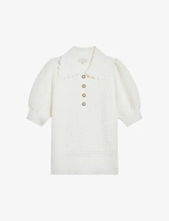 - Regular fit, scalloped trim collar, exposed button placket at front, short puff sleeves, fitted cuffs, ribbed trims, all-over textured knit, gold tone hardware