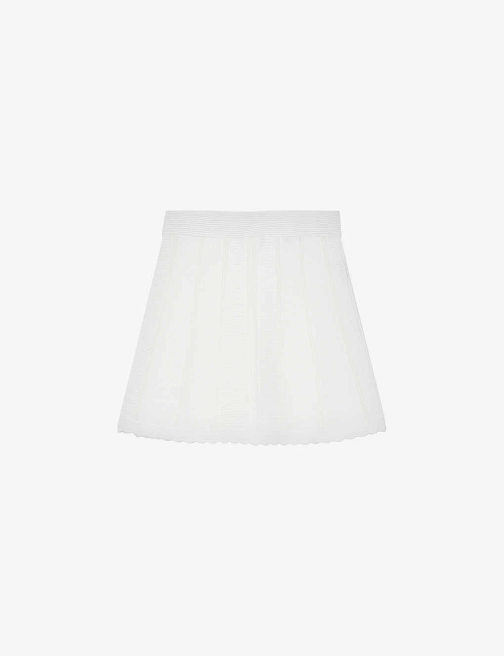 - High-rise, A-line, elasticated waistband, openwork knit, scalloped hem