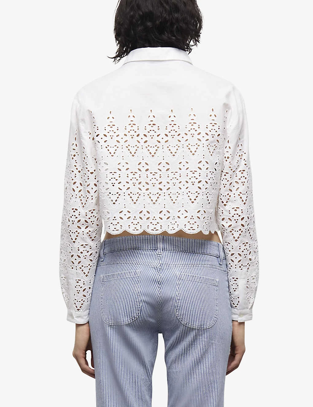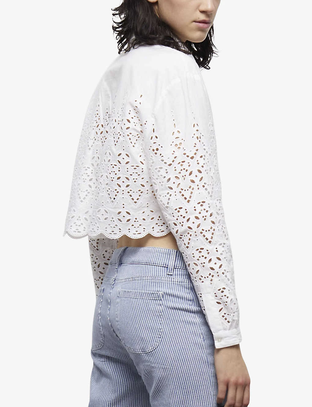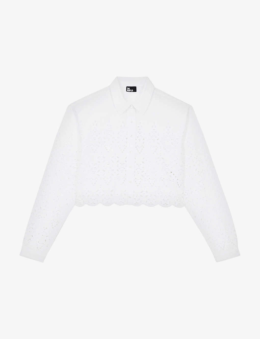 - Long sleeves, spread collar, cropped length, button-through front, all-over broderie anglaise finish, scalloped hem, buttoned cuffs