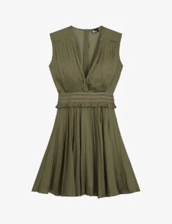 - V-neck, sleeveless, pleated details, structured waistband with ruffle trims, flared pleated skirt